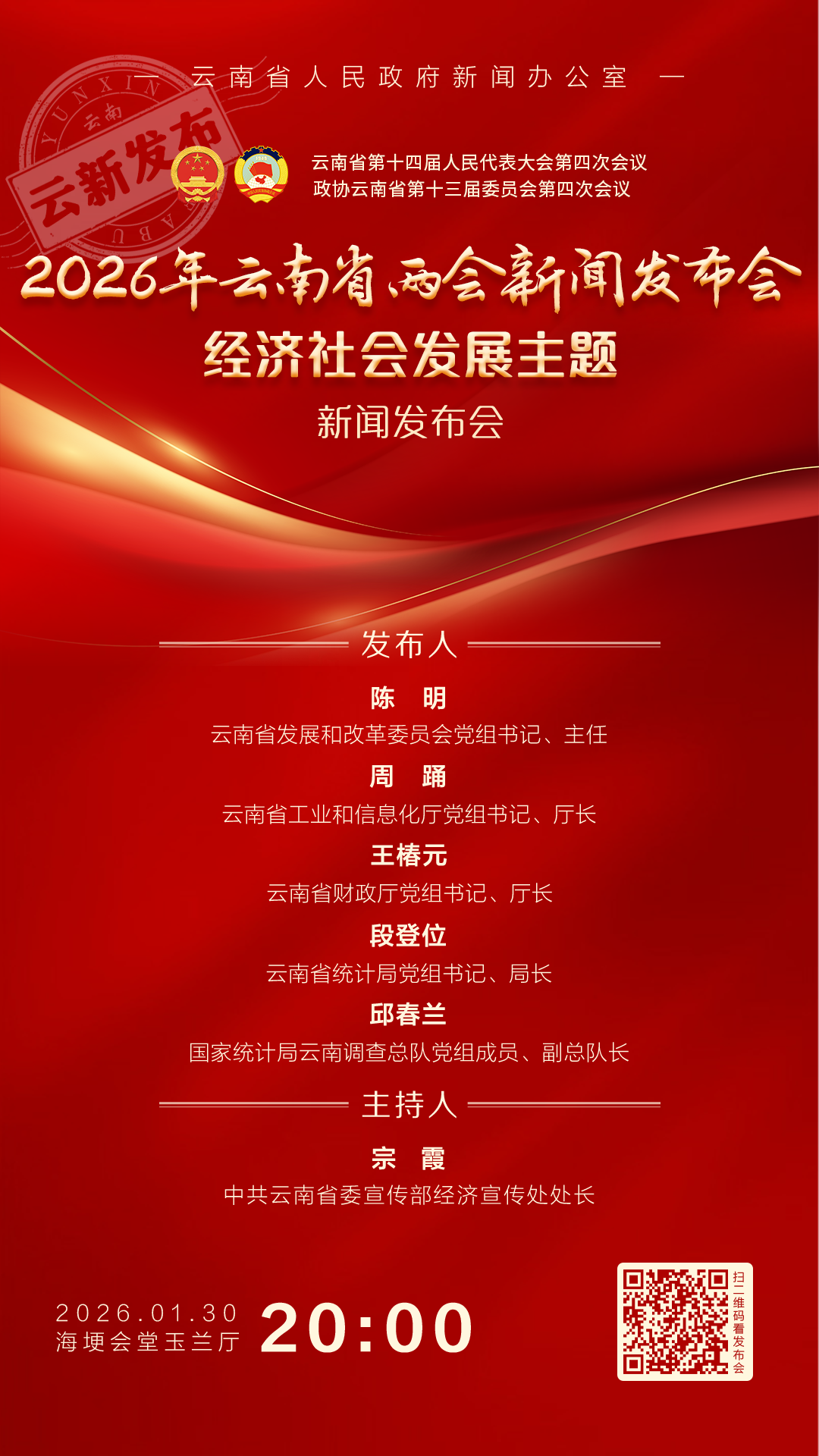 1月30日,云南省人民政府新闻办公室在云南海埂会堂举行2026年云南省两会新闻发布会第三场:经济社会发展主题新闻发布会,省发展改革委等部门介绍相关情况并回答记者提问。