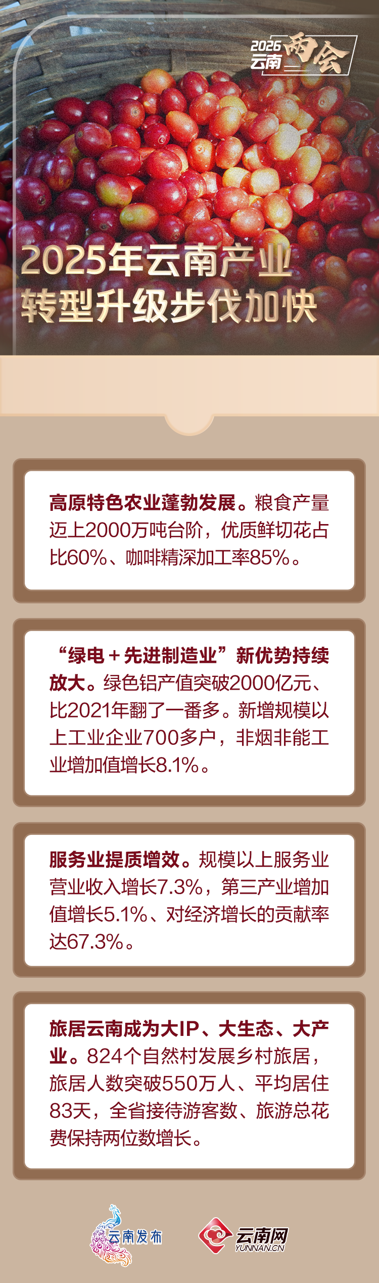 产业转型升级步伐加快,新动能持续涌现。高原特色农业蓬勃发展。抓实“1+10+3+N”重点产业,实施粮食单产提升行动,粮食产量迈上2000万吨台阶;深耕细作种业端、种植端、市场端,大力发展设施农业,优质鲜切花占比60%、咖啡精深加工率85%。“绿电+先进制造业”新优势持续放大。出台支持再生铝产业发展政策,推动魏桥、云铝72.4万吨电解铝产能以及创格、宏砚、智铝等延链补链项目投产,绿色铝产值突破2000亿元、比2021年翻了一番多。裕能、杉杉、亿纬锂能等新能源电池企业满产运行,产业增加值增长75.9%。用好省级10亿元工业稳增长财政资金,新增规模以上工业企业700多户,非烟非能工业增加值增长8.1%。服务业提质增效。完善十大重点服务业工作机制,用好存量、增量、企业赋能“三张清单”,规模以上服务业营业收入增长7.3%,第三产业增加值增长5.1%、对经济增长的贡献率达67.3%。旅居云南成为大IP、大生态、大产业。实施旅居云南建设三年行动,开列正负面清单,824个自然村发展乡村旅居,旅居人数突破550万人、平均居住83天,全省接待游客数、旅游总花费保持两位数增长。