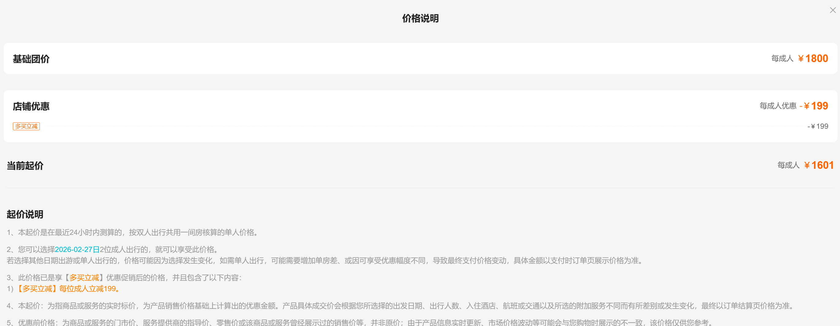 线路成本参考价/人=星级房价/人×入住天数+团队餐价/人×用餐次数+A级旅游景区门票价格/人+用车费/人×用车天数+综合服务费/人×出游天数+导游服务费/人×出游天数+保险费