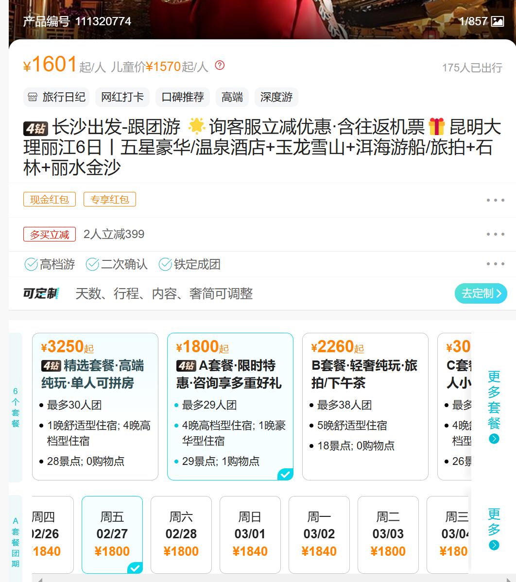 2026年2月1日,云南省文化和旅游厅综合执法监督局联合文旅头条新闻网游舆大数据中心监测到:长沙出发-跟团游询客服立减优惠·含往返机票昆明大理丽江6日|五星豪华/温泉酒店+玉龙雪山+洱海游船/旅拍+石林+丽水金沙