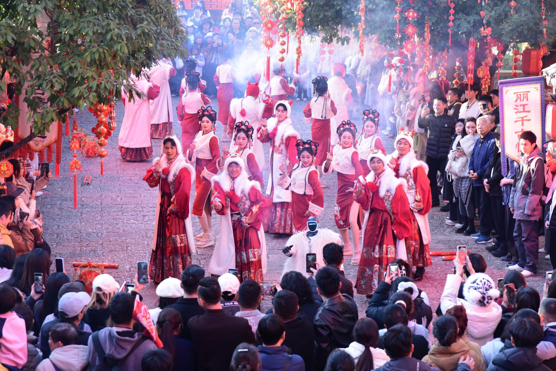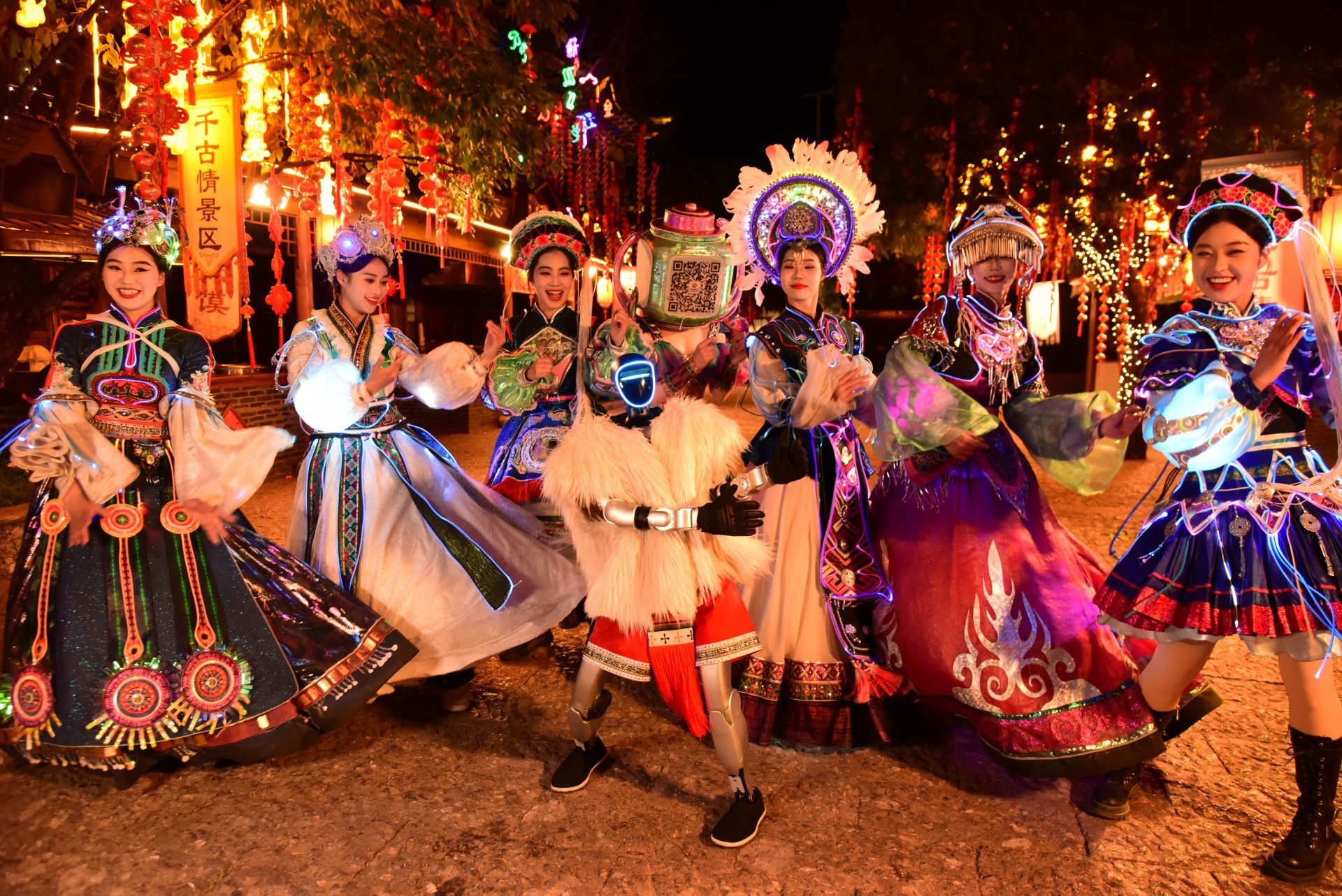 上天入地,穿越古今!丽江千古情景区不仅是一座活着的茶马古城,更是一个融合智慧科技与绚烂演艺的文化舞台。机器人穿上纳西服饰,与游客亲切互动、共舞同乐,“你好!机器人”作为贯穿外景动线的科技互动亮点,为传统年味注入了现代活力。“新春火舞盛宴”燃出千般焰色,火魔方飞旋火星四溅,火刀裂空长焰如龙,火壶流光燃烧千年一梦……汇聚各种非遗绝技的火秀奇观,让游客们目眩神迷!祥瑞开道,龙狮逐浪,各族儿女锦衣如霞,踏歌而行,绕福而跃,寓意着新的一年红火兴旺。