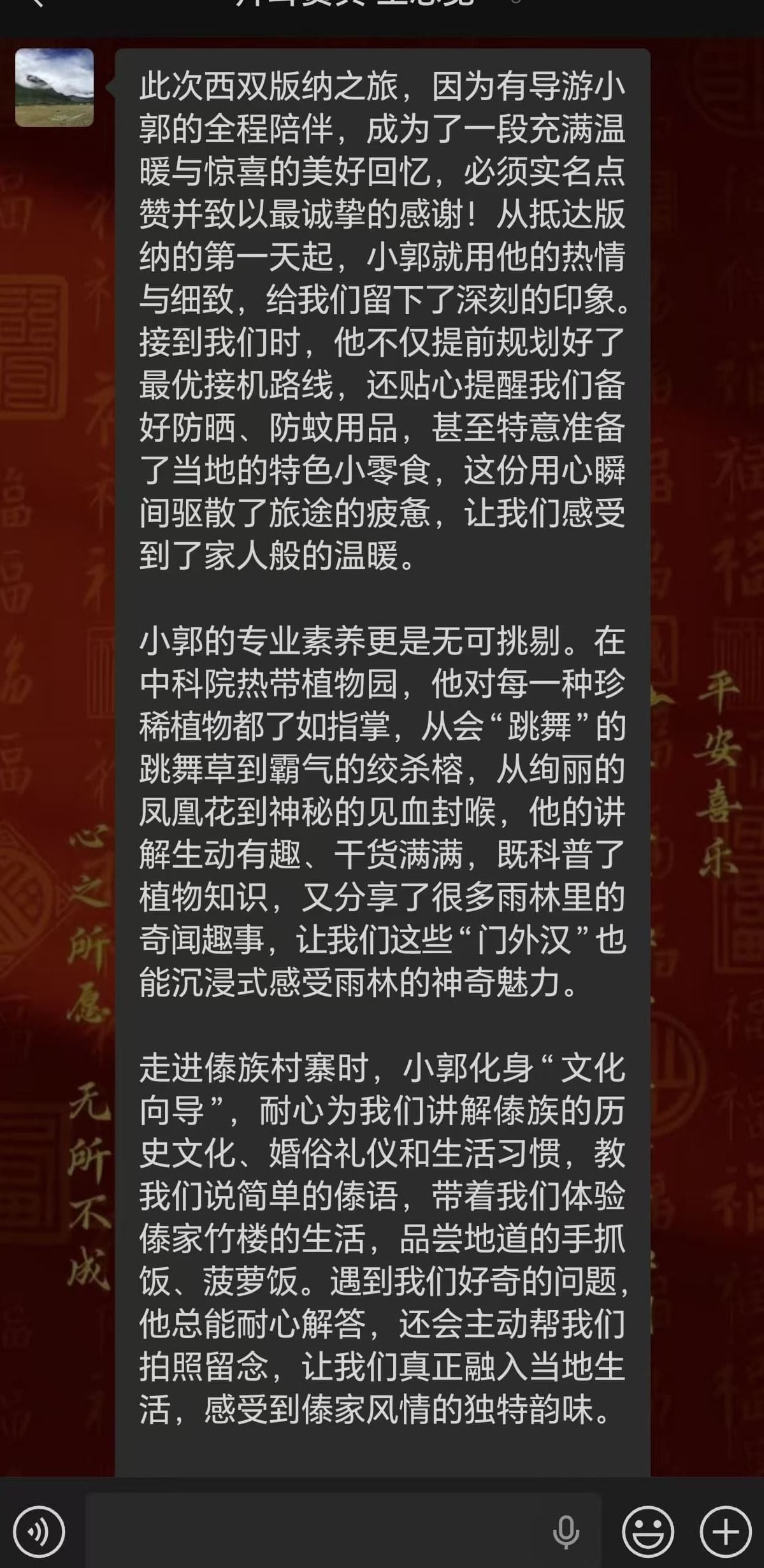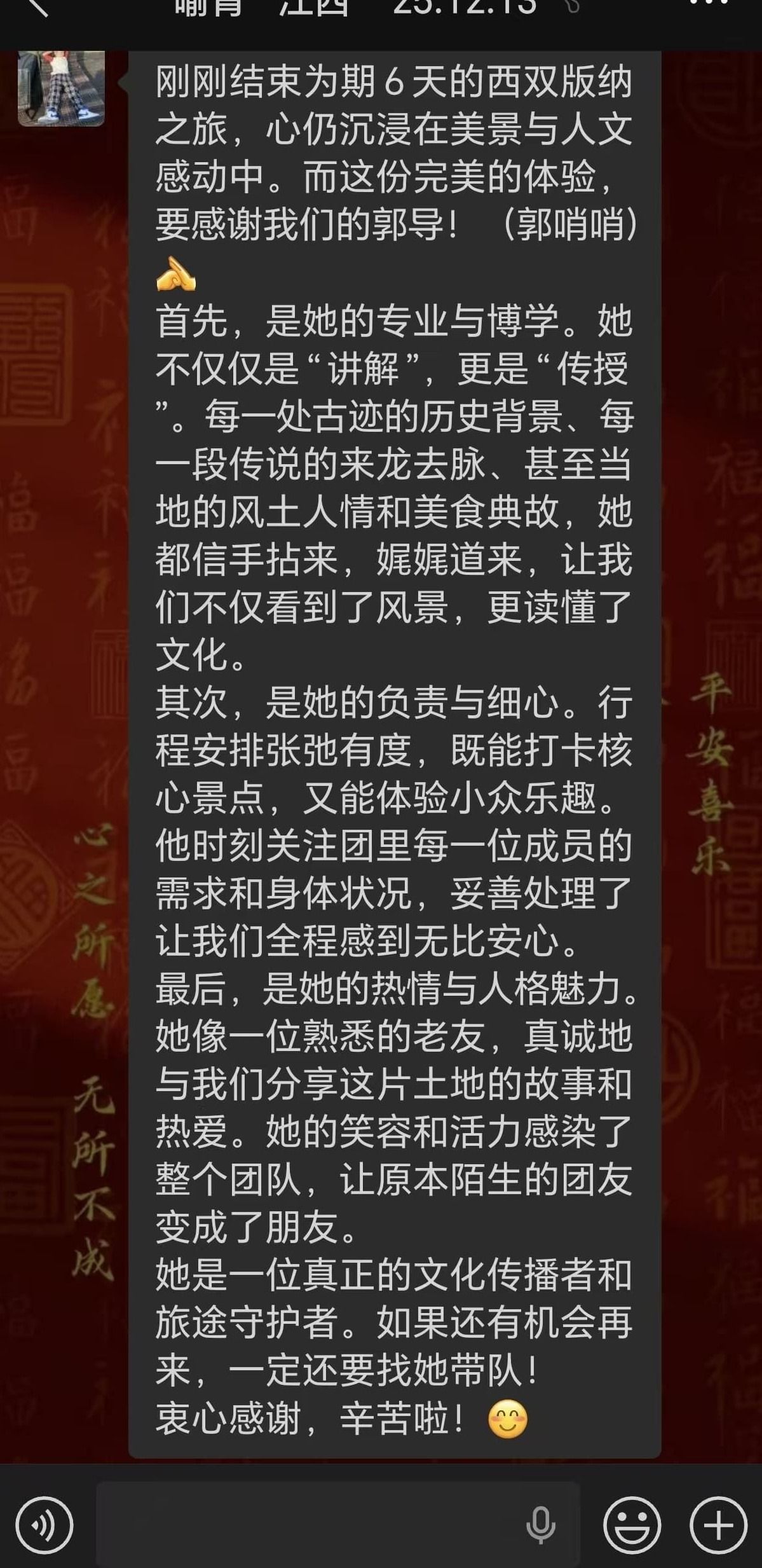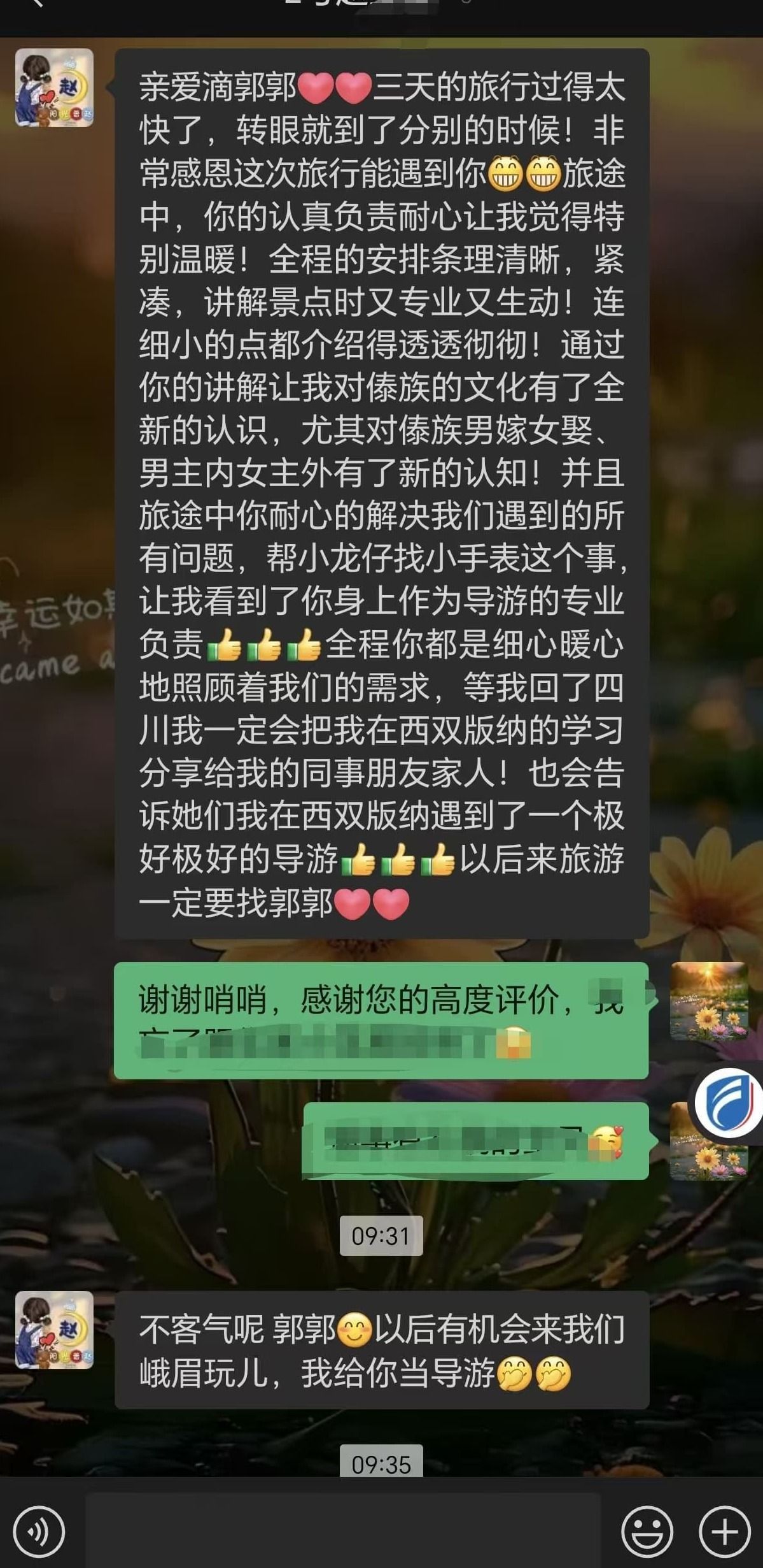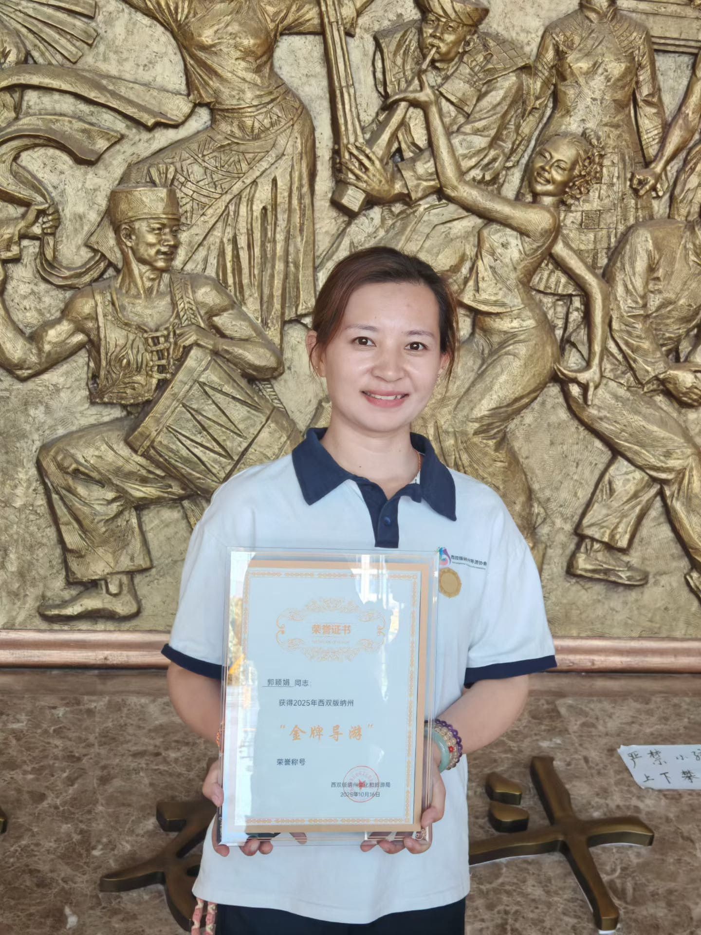 功夫不负有心人。2025年,郭颖娟成功考取中级导游证,为职业生涯树立新的里程碑。她并未止步,主动加入西双版纳州导游协会志愿者团队,以公益讲解员身份服务社会,收获广泛认可。同时,她踊跃参与省、州各级导游大赛,在竞技中锤炼本领、突破自我,不仅斩获佳绩,更获评2025年西双版纳州文化和旅游局认证的州级金牌导游,赢得同行的尊重与赞誉。