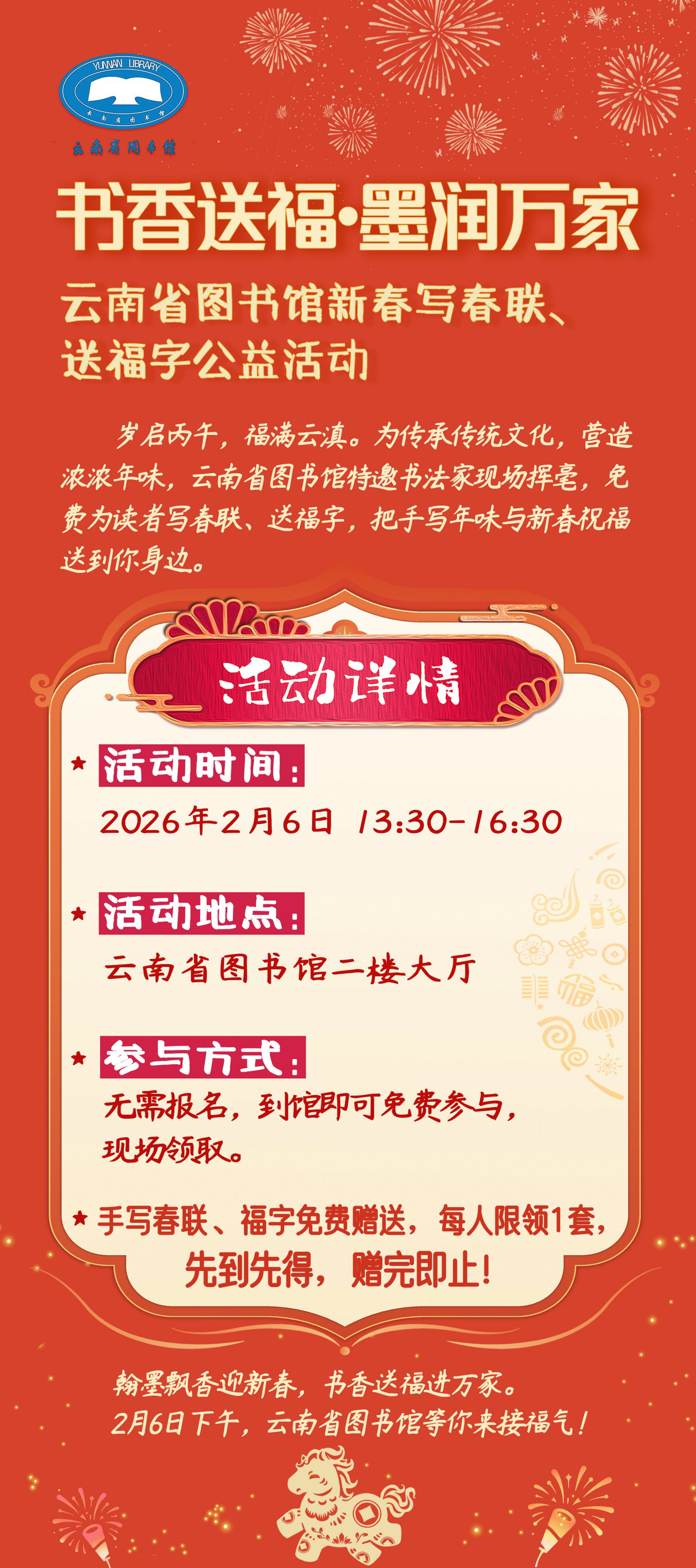 此次活动由省图书馆主办、宣传策划部承办、神州共享文化传媒协办,是文化惠民与传承文化的具体举措,让市民在喜庆中亲近文化、感受公共文化服务温暖。诚邀市民走进图书馆,接福字、赏文艺,欢欢喜喜过大年,共迎丙午马年,活动详情可关注云南省图书馆官方平台查询。
