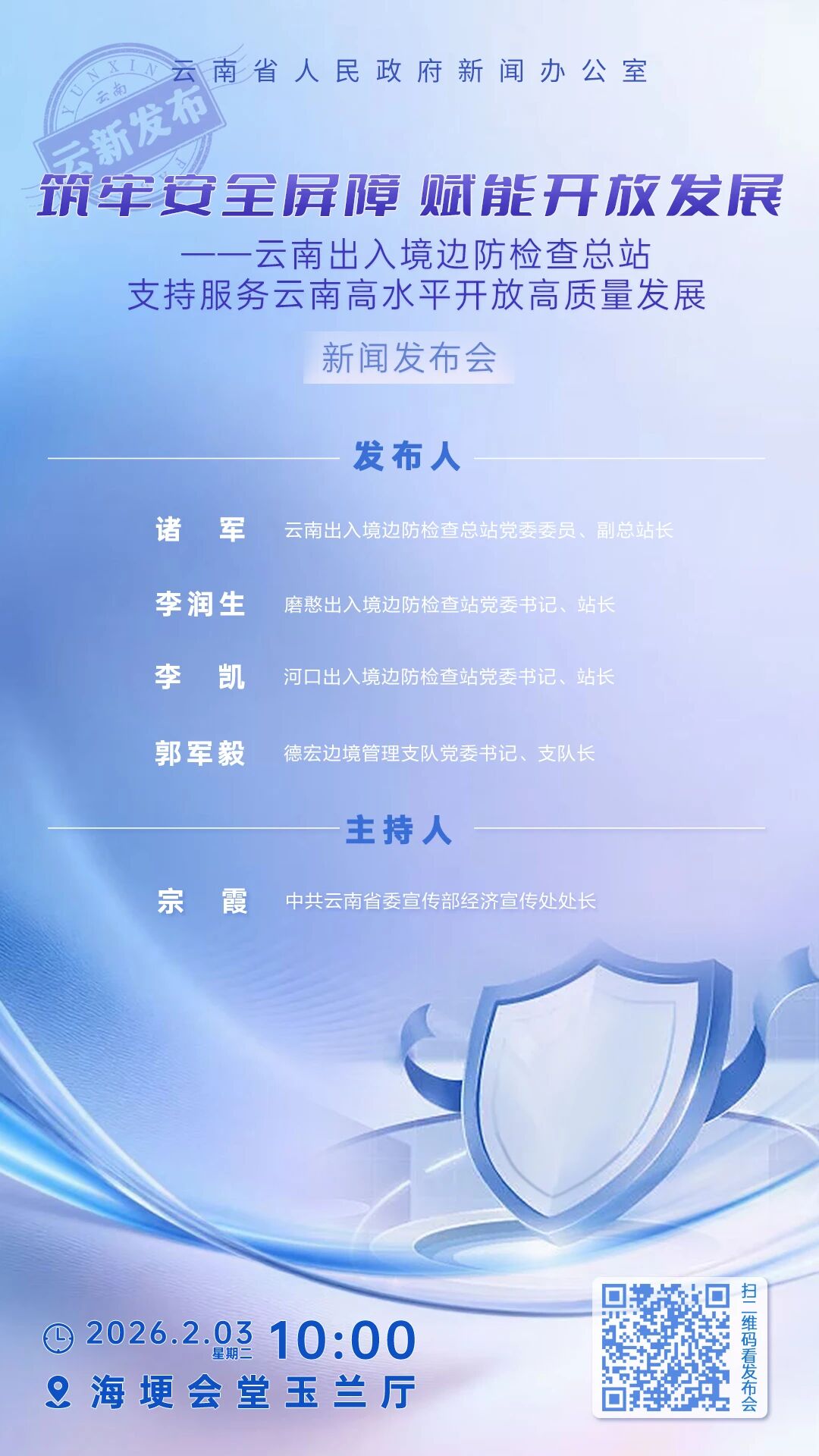 2月3日,筑牢安全屏障 赋能开放发展——云南出入境边防检查总站支持服务云南高水平开放高质量发展新闻发布会在云南海埂会堂举行,云南出入境边防检查总站等介绍相关情况并回答记者提问。