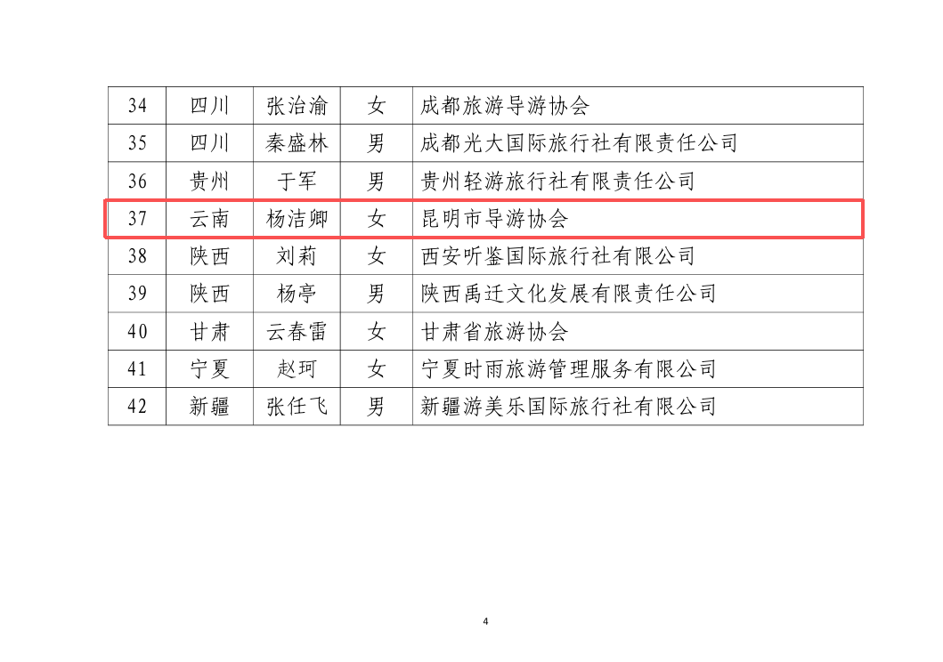 近日,文化和旅游部市场管理司公示2025年全国特级导游等级考核拟获评名单,公示时间为2026年2月4日至10日。其中,云南有一人上榜,为昆明市导游协会的杨洁卿。公示全文如下——