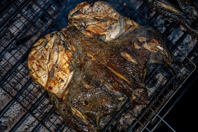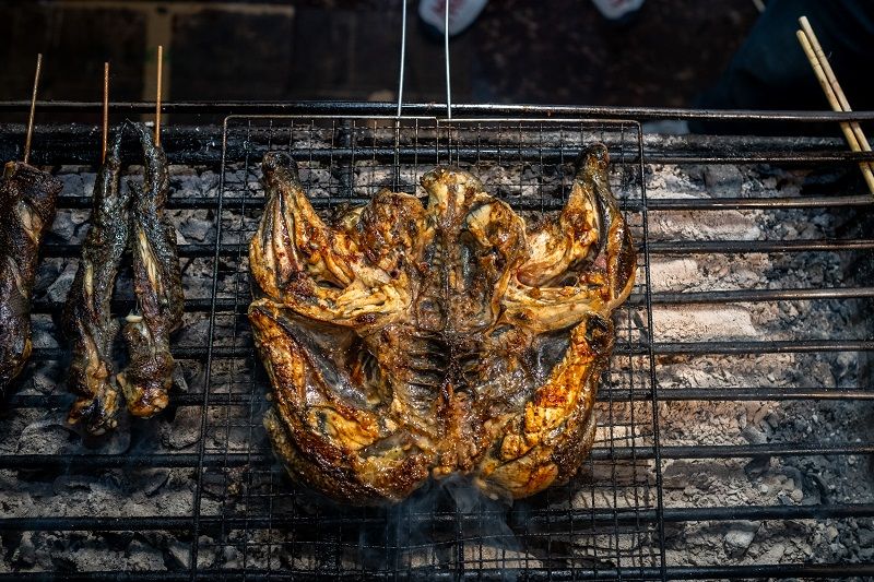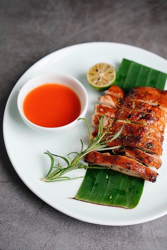 每只烤鸡都选用德宏山林放养土鸡,肉质紧实、皮薄脂肪少,自带山林本鲜;腌制时用姜蒜、小米辣、芫荽和傣族香料涂抹全身;采用本地果木炭火慢烤,反复刷香料鸡油,香气四溢,待鸡皮金黄油亮、轻按紧实,用芭蕉叶点缀即可出炉;食用时蘸上特制蘸水,炭香与肉香在口中交织,鲜醇入味,让人欲罢不能。