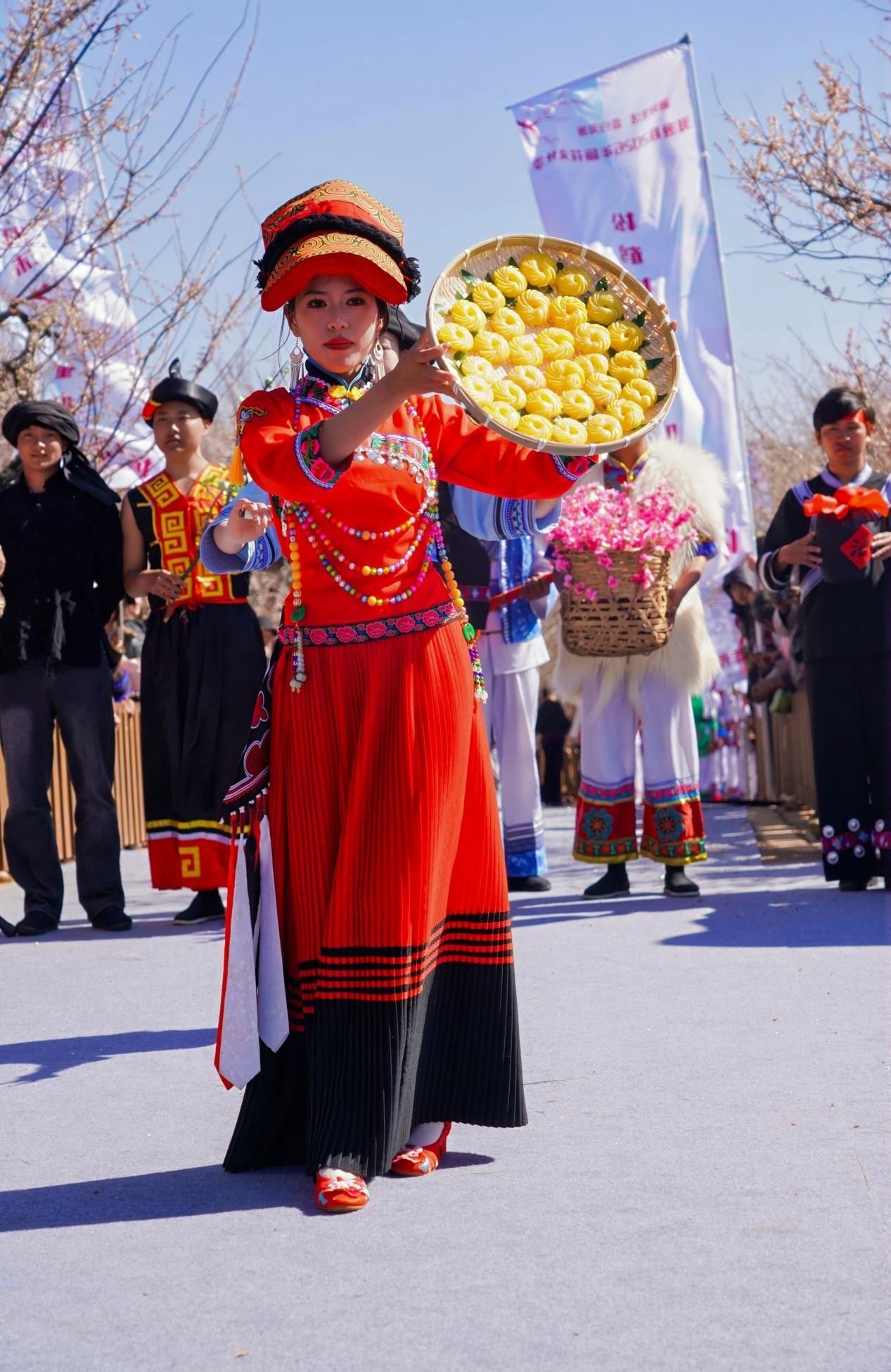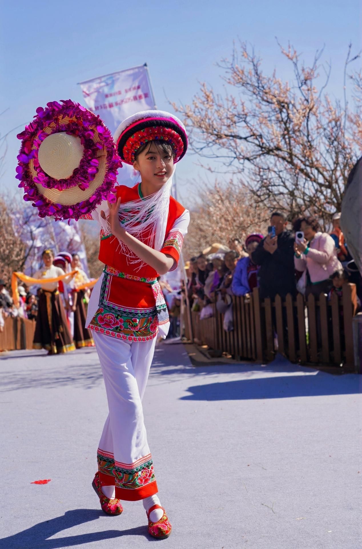 当天的嘉年华现场,梅林走秀将氛围推向了高潮。松鹤村梅林化身天然T台,各走秀队伍身着绚丽多彩的民族服饰款款走来,精美的刺绣、灵动的配饰与阳光照耀下的梅花相映成趣,模特们迈着优雅的步伐,在梅枝间穿梭,将民族文化的魅力与梅花的清雅风姿完美融合。现场掌声、欢呼声此起彼伏,游客们纷纷举起手机,定格这一美好瞬间。