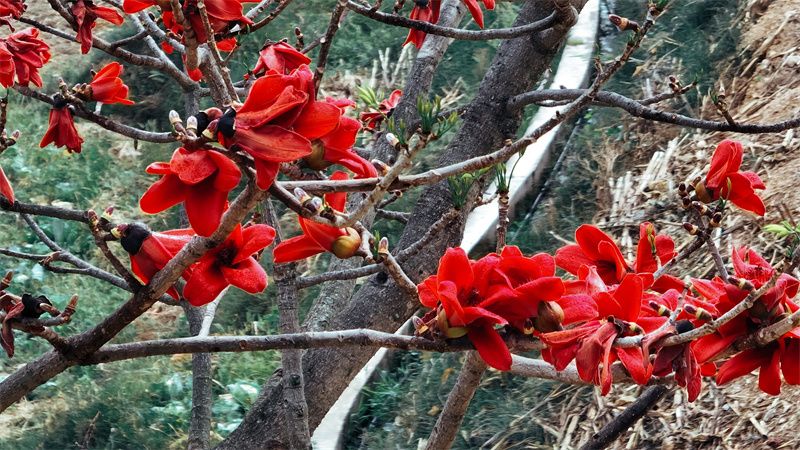 沿江木棉热烈盛放,一树树炽烈火红,映着碧绿江水,明艳又壮阔。