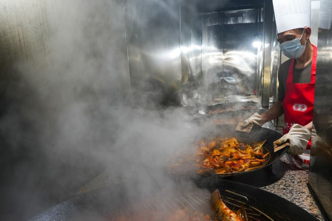 农历腊月廿二,江川区的街头巷尾年味渐浓。江川大头鱼酒店后厨里蒸汽腾腾,鲜香四溢,厨师娴熟地烹制着大锅菜和古法盐水鱼,利落的动作间,凝聚着几十年的手艺。“一进腊月,来寻家乡味的游子就多了,都说若吃不上这鱼和大锅菜,便没有年味。”江川大头鱼酒店创始人赵金会说,归乡游子常把这里当作返乡后的第一站,就为一解心底的乡愁。