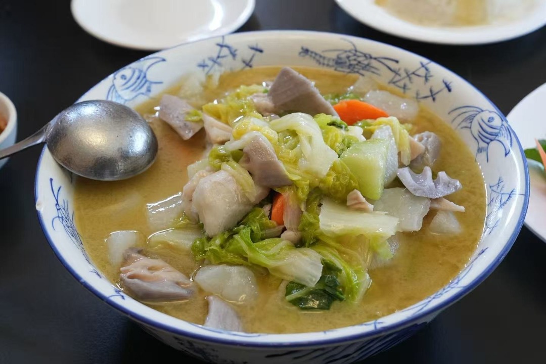 烹制地道的大锅菜颇有讲究:需用传统大锅,以木柴或炭火慢熬,食材下锅顺序也半点不能乱。先将五花肉、筒子骨等肉类,加入少量盐、草果等调料慢熬两三个小时,直至肉质软烂、汤汁呈奶白色;再依据蔬菜的易熟程度依次焖煮二十多分钟,使食材相互入味、风味交融。成菜后一口下去,尽是纯粹的乡土本味。