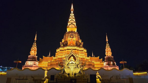 塔顶选用暖金色光源,以窄角光束精准投射鎏金表面,使金顶在夜色中如晨曦泛光,成为远处可辨的地标;塔身佛龛与浮雕区域,采用隐藏式线性洗墙灯,光线自下而上均匀晕染,柔和展现雕刻细节,营造庄严静谧之感;塔基与近人处则使用低亮度防眩光地灯与壁灯,以暖色光晕轻轻烘托建筑,在视觉上衬托塔身巍峨气势,同时保障夜间通行安全。
