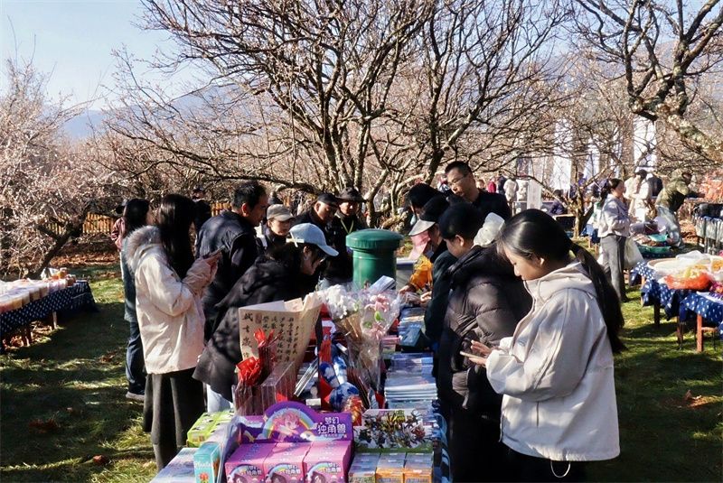 “梅好喜市”里,雕梅、乳扇、甲马等非遗技艺现场展演,洱宝梅果产品、松鹤村特色梅货琳琅满目,村民们一边展示雕梅技艺,一边售卖梅果特产,让非遗“活”起来,让群众富起来;梅林走秀以花海为天然舞台,传统服饰与寒梅相映成趣,演绎出人与自然和谐共生的美好图景;“梅香邮驿”“梅树下的咖啡”更是将传统与现代融合,为游客打造沉浸式赏梅体验。