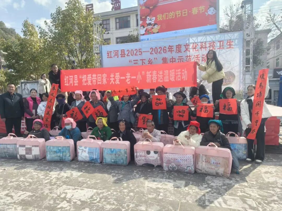 在红河县近日开展的文化科技卫生“三下乡”集中示范活动中,红河县总工会围绕“一老一小”群体需求,将关怀服务与政策宣传带到垤玛乡群众身边,以实际行动参与乡村建设、服务基层民生。