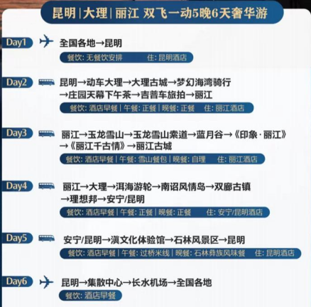 该旅游产品广告链接:全国出发昆明大理丽江双飞一动6天奢华跟团游一价全含0自费双表演