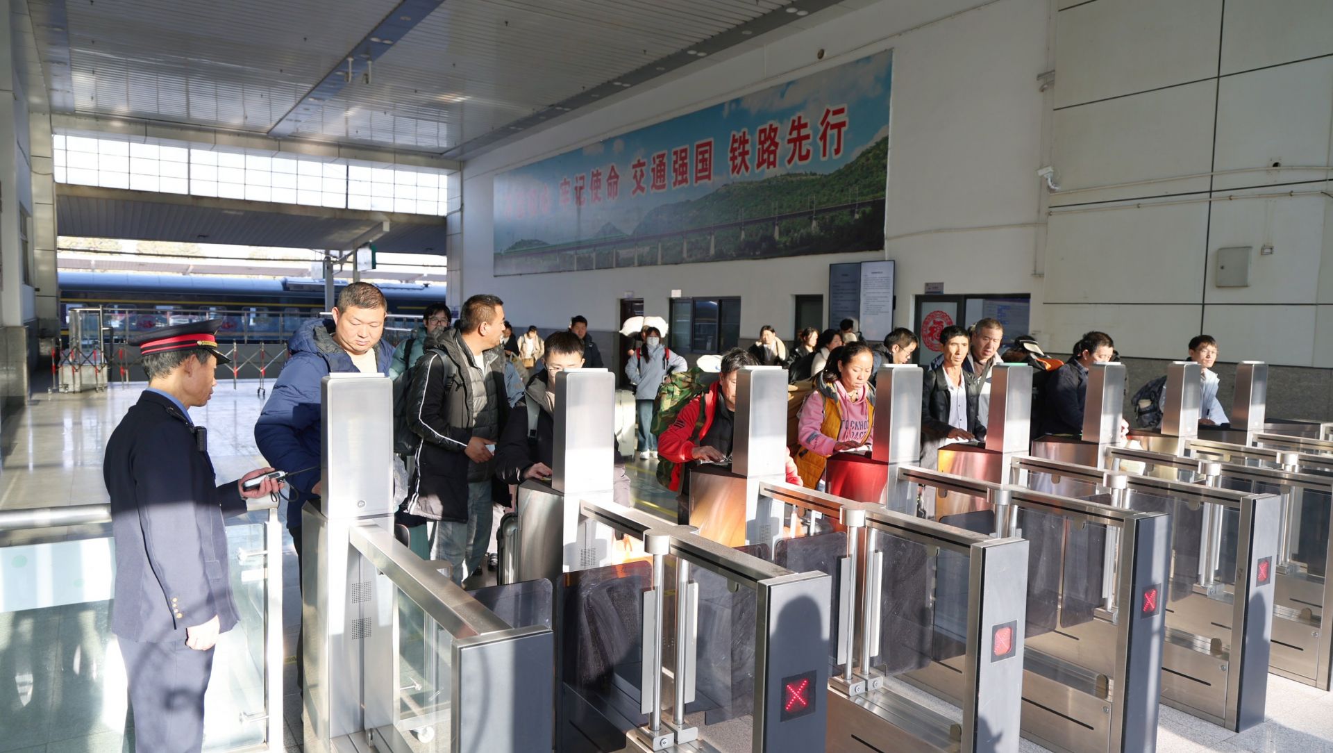 “请出示身份证”“看好小朋友,别挤”……人工检票口,工作人员手上的动作精准迅速——验证、递还、指引,一气呵成。他们告诉记者,这样的动作每天要重复上千次。“不能错,也错不起。”说话时,他们的目光仍落在旅客手中的车票上。