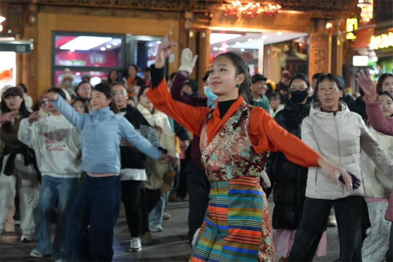 美食的余香仍在缭绕,直播的焦点已转向古城的“心脏”——四方街。这里曾是茶马古道上马蹄声声的商贸枢纽,如今是每晚以舞会友、以舞绘圆的舞台,现场游客、市民与身着盛装的各族群众一起,在舞蹈演员的带领下共同跳起热情奔放的锅庄舞,随着游人的不断加入,锅庄舞的圈越来越大,伴随着古朴的藏家歌谣,人们手臂起落间挥出的弧度连成了雪域上起伏的山峦。