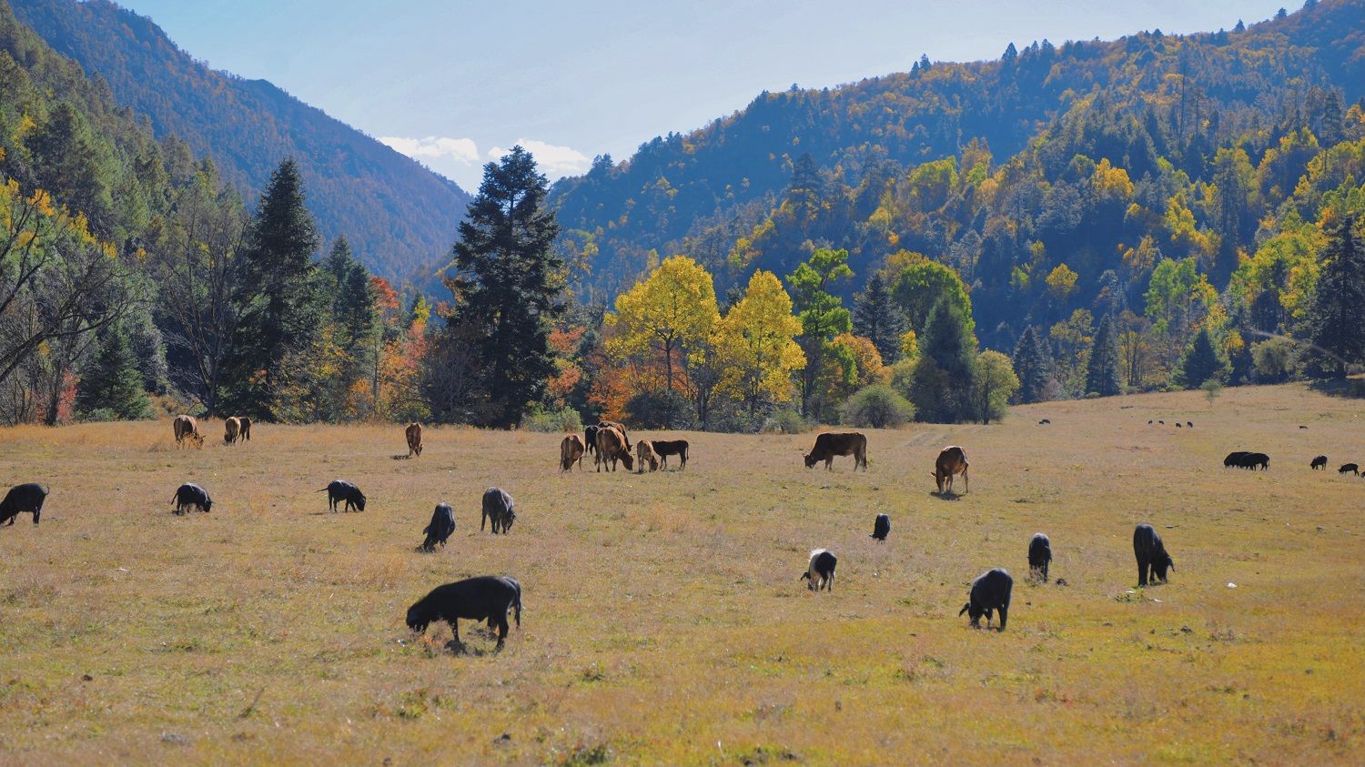 迎着晨光奔赴箐花甸湿地公园,海拔 3200 米的高山秘境铺展开一幅鲜活的自然画卷。辽阔草甸泛着温润的浅绿与枯黄交织的色泽,晨雾如轻纱般在林间流动,阳光穿透薄雾洒下金辉,给大地镀上一层柔光。黑色牦牛踏起细碎草屑,脖颈间的铜铃叮当作响,随手一拍都是充满生命力的动态美景。