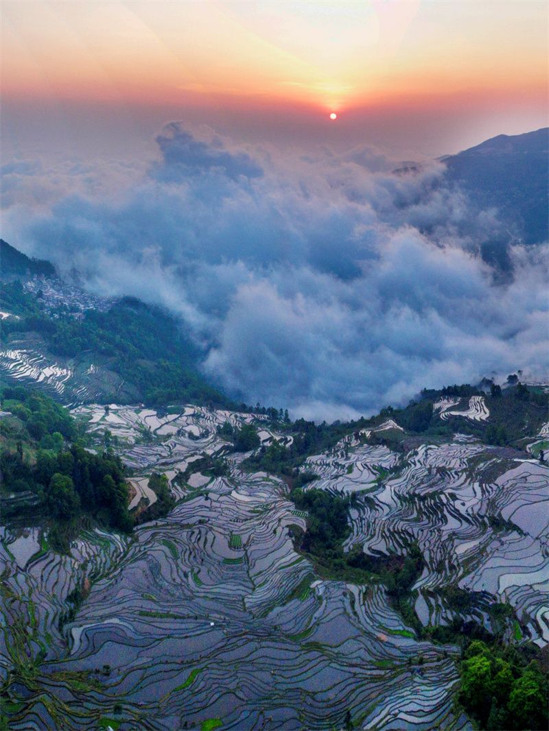 推窗即是灌水期的梯田云海,镜面般的水田倒映蓝天。晨起看云海翻涌,日暮赏晚霞满天,枕着稻香与虫鸣入眠,可下田摸鱼、聆听哈尼古歌,让乡愁在篝火旁被温柔点燃。