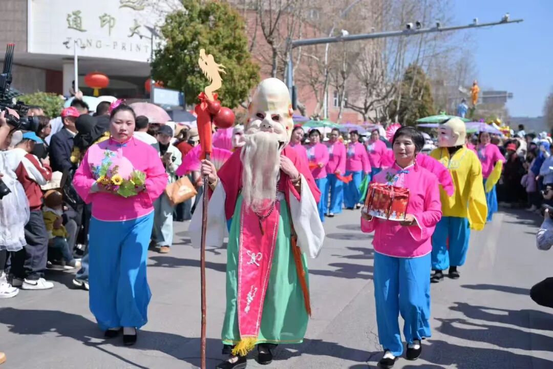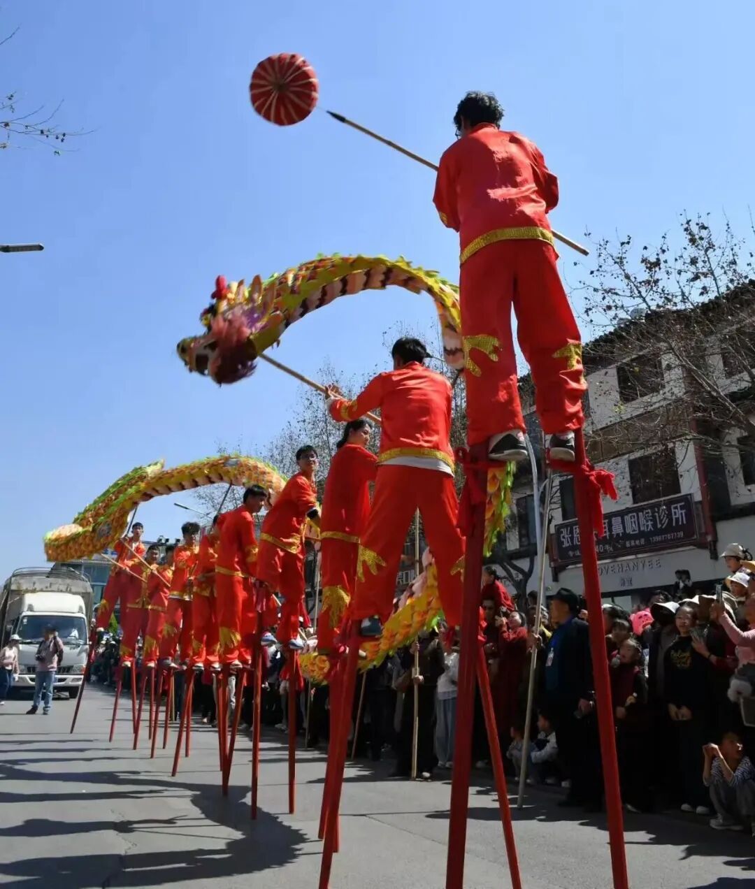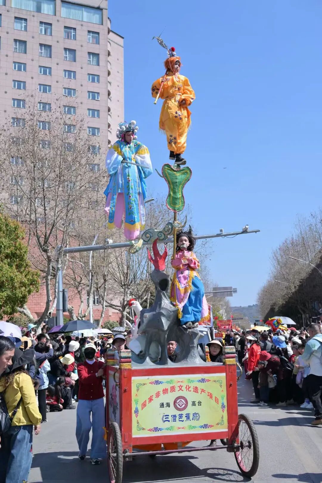 28余支来自各乡镇(街道)、村(社区)、社会团体的表演队伍身着盛装轮番登场:超群机车队激情开道,通海县国家级非遗项目通海高台展现高超技艺;国家级非遗项目洞经音乐(九龙洞经古乐团)倾情演出;省级非遗项目高跷舞狮精彩亮相;杨广十八班武艺轮番上阵;汉服、旗袍、马面裙展现传统服饰文化,腰鼓队锣鼓喧天,舞龙、舞狮翻腾跳跃,翩翩起舞的秧歌队,花团锦簇的花车队,欢快跳跃的蚌壳虾灯、大白象表演与沿街群众、游客热情互动,点燃现场氛围。