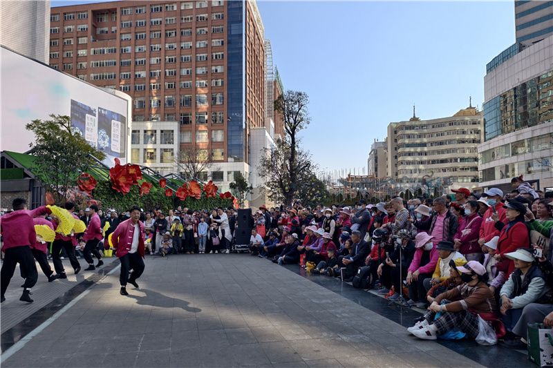 南屏步行街上,一条横幅,接上音响就是舞台,观众围得里三层外三层,有全国各地的游客,也有很多老昆明。严大妈说自己是个花灯迷,每年春节,不管子女怎么邀请,她哪都不去,就和老姐妹约着来看演出,“追着看了好几年。这样的公益演出太好了,表演好,节目又多。”江苏游客张先生带着一家老小高高兴兴地看演出,他说云南的天气太好了,晒着太阳,看着云南风味的歌舞,是了解云南的另一种方式。