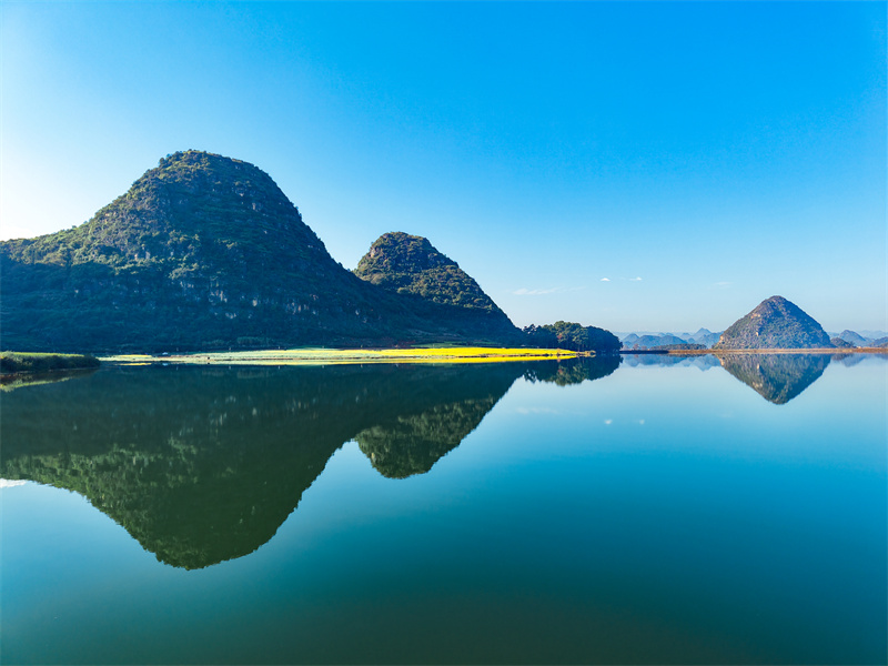 他们说这是滇南赛里木,静谧湖水如琉璃镜面,尽数倒映天光云影与浅草孤峰,澄澈又温柔。