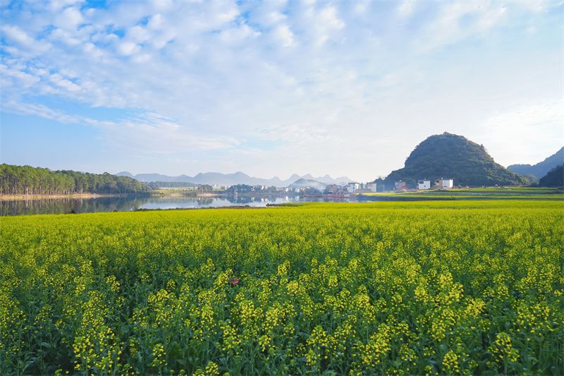 这里还像江南一隅,金黄油菜花依着田埂错落盛放,不逞无边浩荡,只以恰到好处的明媚铺展山野,与炊烟袅袅的村寨相依相融,峰林作幕、云影为衬,把春日酿成温润富足的田园诗。