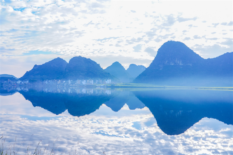绕过湖湾,景致越发温柔。田畴间,油菜花不急不躁地开着,不铺陈漫天金黄,只以恰到好处的明媚点缀着村舍。青瓦人家升起袅袅炊烟,与峰林、花田、云影融成一幅恬静的水墨,少了西北的寂寥,多了几分江南式的安然。