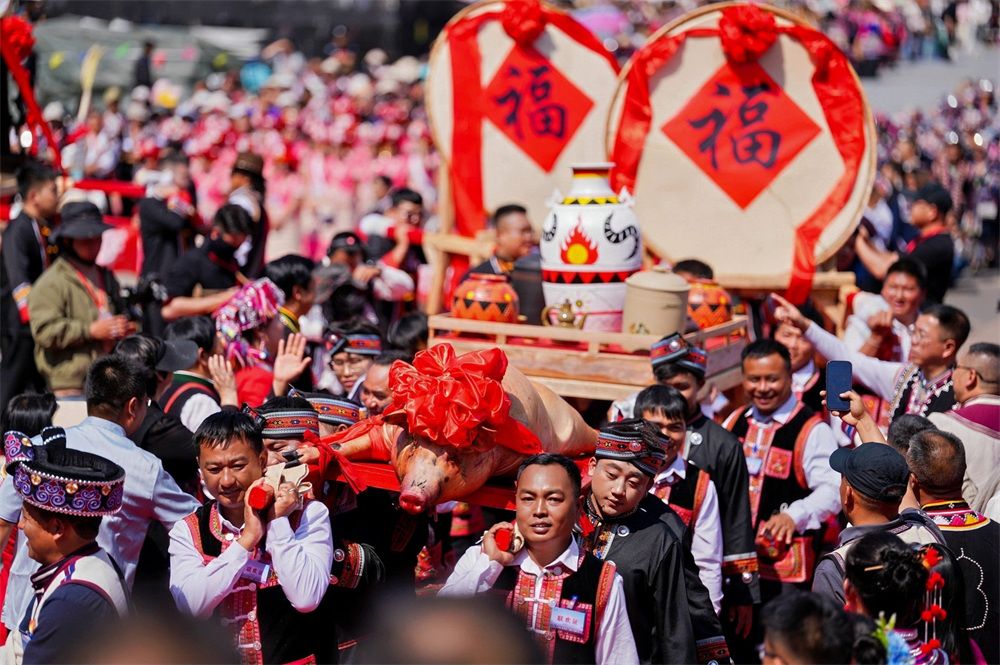 上午,随着几声浑厚的礼炮划破长空,巡游队伍浩浩荡荡地走上街头。最引人注目的是极具拉祜特色的“拜年团”。他们有的肩扛甘蔗,寓意新的一年生活“节节甜”;有的手捧大如簸箕的糯米粑粑,象征团圆与富足;还有的背着金黄的蜂蜡和自家酿制的醇酒,向沿途的观众致以最质朴的节日祝福。