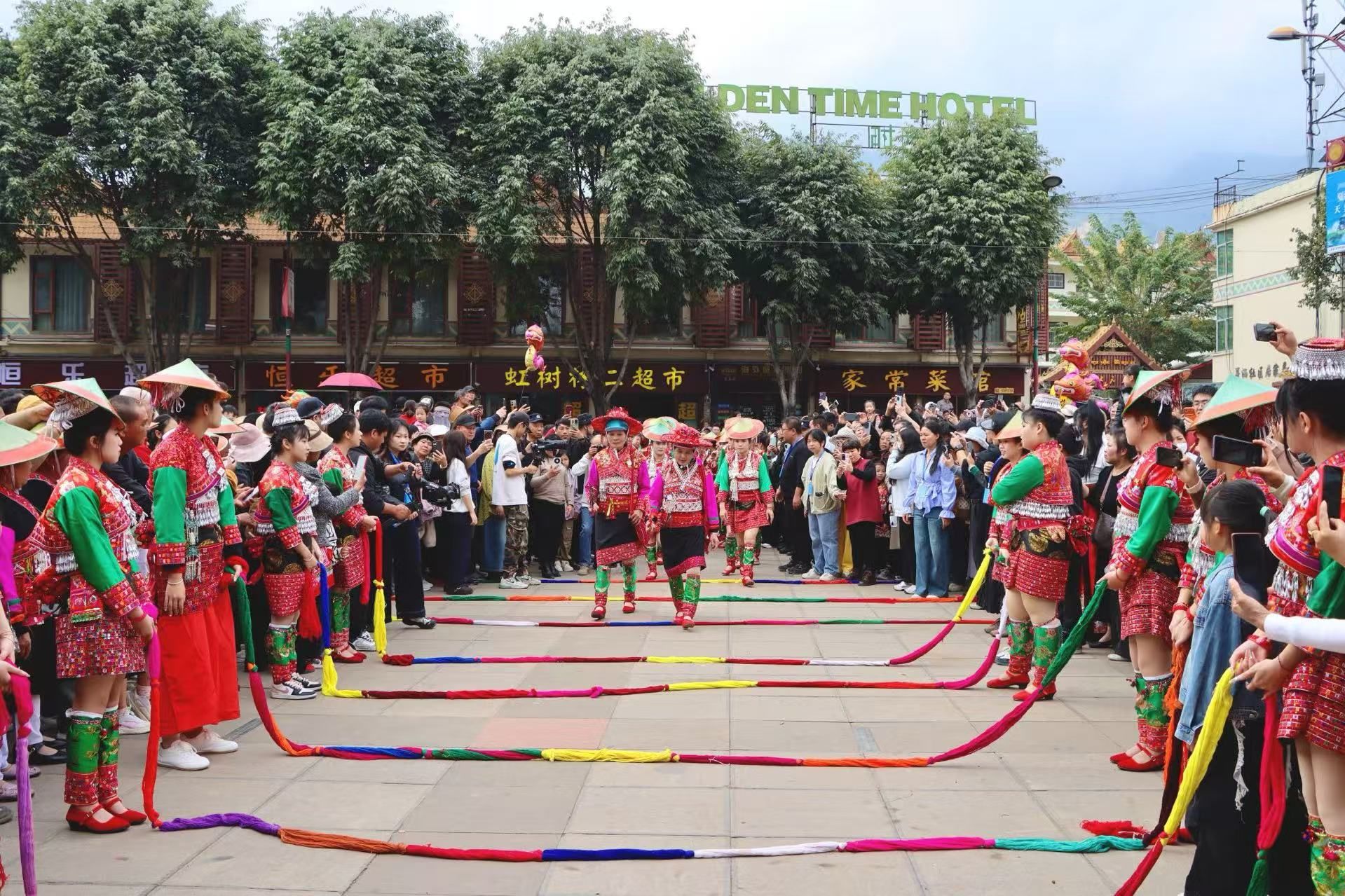 巡游队伍行至凤凰广场入口,一场传统的花腰傣迎宾礼精彩上演。在“小卜少”们的引领下,游客们跨过吉祥彩带,拾级而下步入广场。伴随着节奏明快的旋律,身着盛装的傣家姑娘围圈起舞,银铃悦耳,舞姿古朴柔美,尽情释放着傣家人的热情。在浓厚的节日氛围感染下,不少游客情不自禁地加入舞池,现场一片欢腾。
