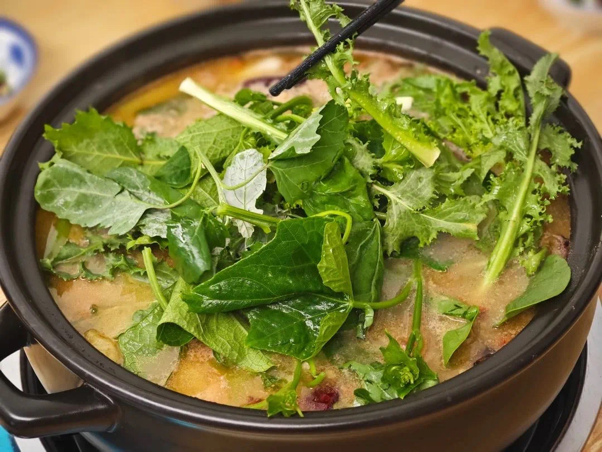 而楚雄的山野之味,藏在野菜火锅里,上百种当季野菜搭配手工豆米肉圆汤底,入口先苦后甘,藏着城市里难寻的天然鲜味。