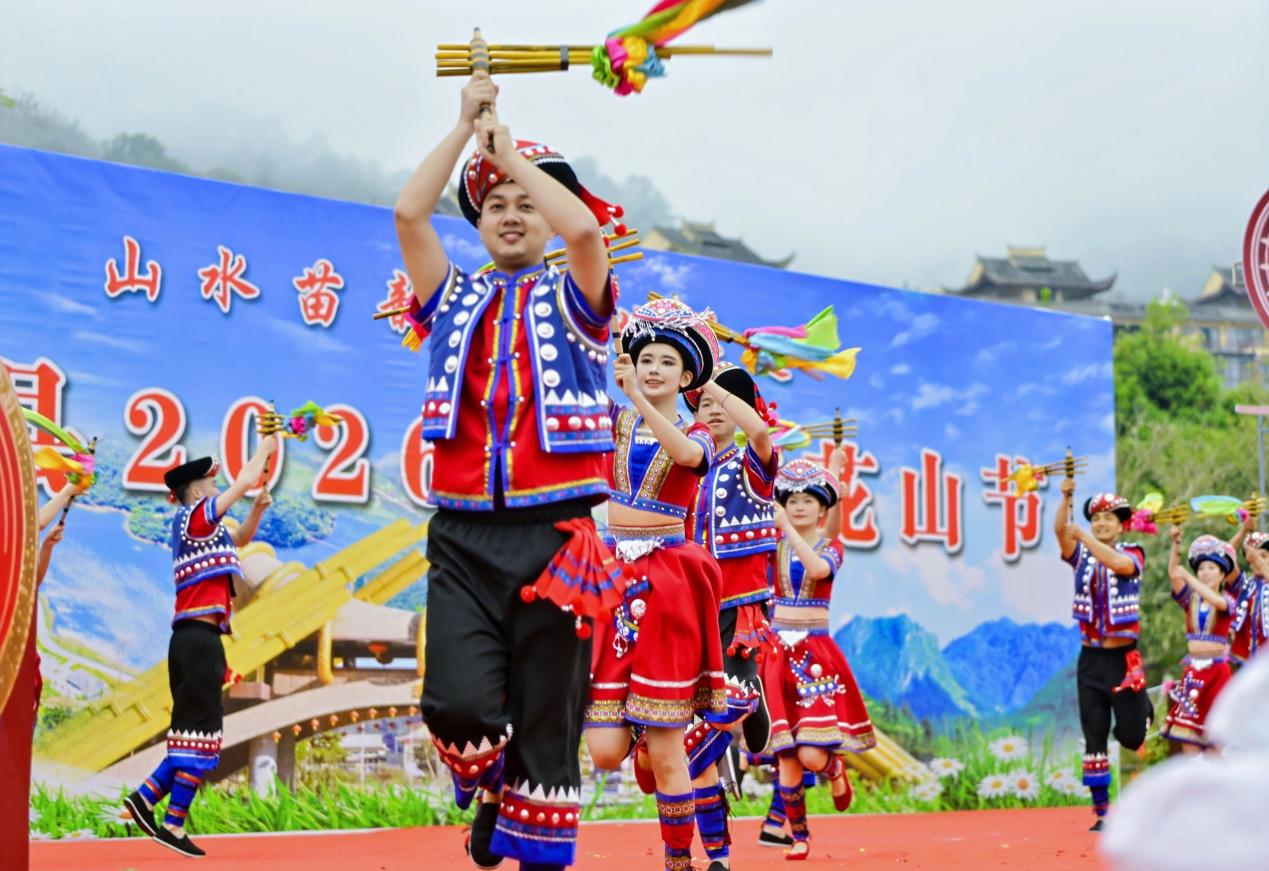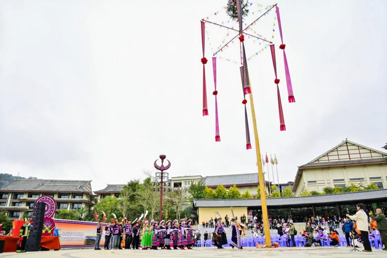 上午九点三十分,庄重的祭花杆仪式拉开节日序幕。祭祀队伍面向象征吉祥与丰收的花杆虔诚敬祭,祈求风调雨顺、幸福安康。仪式最后,象征献祭的猪头与代表欢乐的芦笙共同被挂上花杆,为祈福画上圆满的句点。随后,以“山水苗韵 云端屏边”为主题的开幕式文艺演出精彩上演,演出分为“踏歌春山、魅力苗山、情满花山”三个篇章,欢快的酒歌表演唱《举盏欢歌》、优美的女子群舞《织月流光》、深情的情歌对唱《花伞情缘》等节目,将民族风情与节日喜悦展现得淋漓尽致。悠扬的芦笙与激昂的旋律交织,绚丽的服饰与动人的舞姿辉映,不断将现场气氛推向高潮,引来台下阵阵掌声与喝彩。身着绚丽苗族盛装的各族群众往来其间,成为节日里一道动人的风景线。