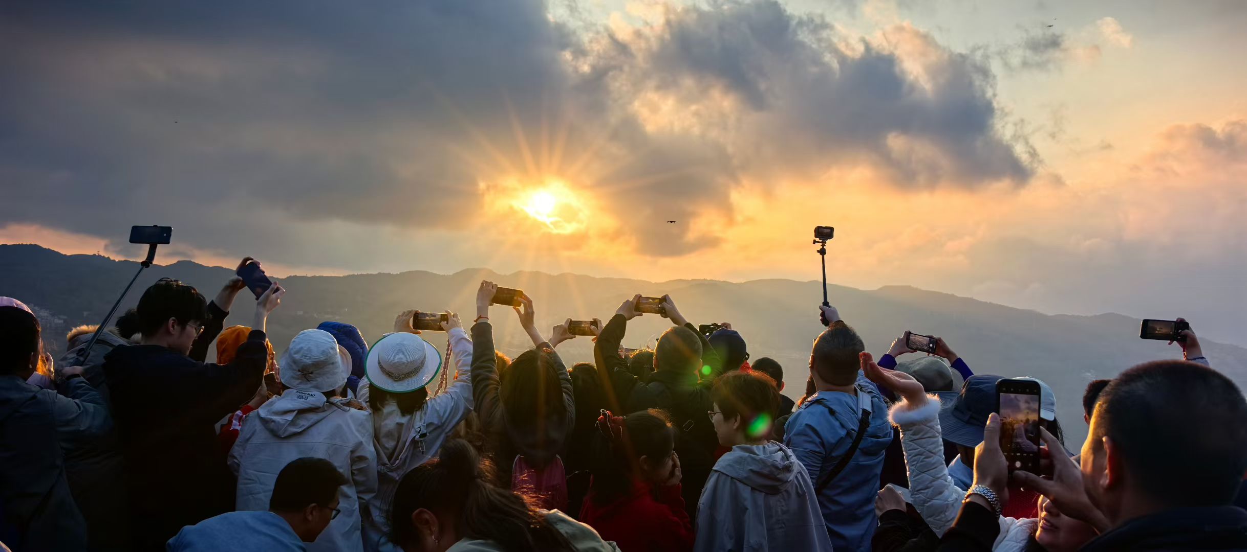 弥勒的热度,从停车场就能看出“端倪”——东风韵、太平湖森林公园、锦屏山风景区、可邑小镇……各大景区停车场爆满,人潮汹涌。白天,郁金香花海旁拍照打卡的人络绎不绝;彝族阿细婚俗表演,让游客沉浸式感受民族风情,1999级台阶上,登高祈福的身影络绎不绝。入夜,璀璨烟花点亮夜空,歌声响彻湖泉,从清晨到深夜,弥勒的精彩一刻不停。