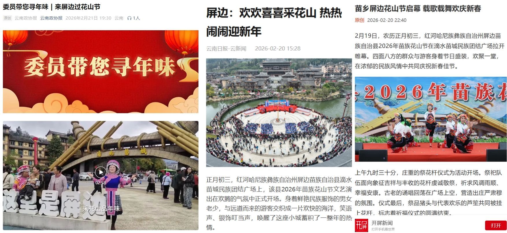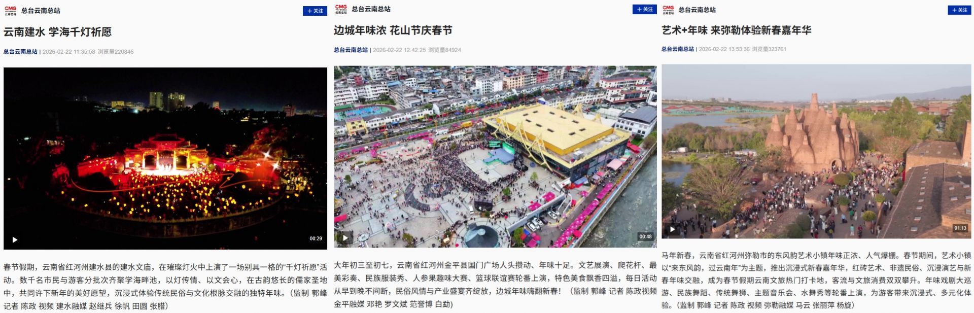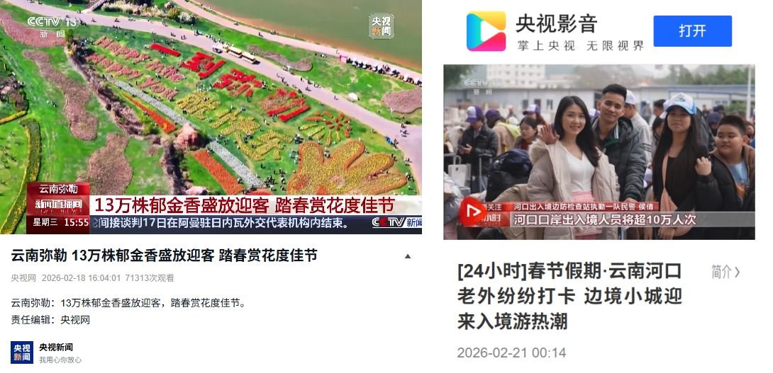 红河新春美景与特色活动强势出圈,刷屏各大平台、引爆全网流量,“红河年味”成为全国关注的文旅热点。假日期间,红河元素汇聚央媒,弥勒郁金香花海、河口边境游、建水古城非遗盛宴等相继登上CCTV-13新闻频道,央视总台相继报道《艺术+年味 来弥勒体验新春嘉年华》《边城年味浓 花山节庆春节》《云南建水 学海千灯祈愿》;人民网、中新网聚焦建水、石屏“龙狮闹古城”,点赞非遗新春盛宴;元阳哈尼梯田迎来最佳观赏期,人潮涌动,获得《中国国家地理》推荐;红河县凭借哈尼梯田落日美景登顶新浪微博同城热搜,获人民网云南频道、云南发布等多家媒体点赞;屏边苗族花山节吸引云南日报、云南广播电视台、开屏新闻等省级主流媒体聚焦报道。全方位、多角度的宣传推介,让红河风情“火”遍全网,红河文旅品牌知名度与影响力持续攀升。