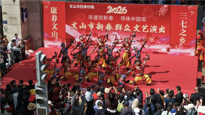 其中,苗族花山节在全州遍地开花,文山市“锦绣文山 拳王花山”将传统民俗与体育竞技融合,广南县在坝美、六郎城景区推出民俗体验、剧情演绎等沉浸式活动,富宁县举办国门花山节、山歌擂台赛,非遗展演、民俗互动、年货展销等内容相融,让游客在体验民族文化中感受别样年味,也让文山成为马年春节周边游、民俗游的热门选择。