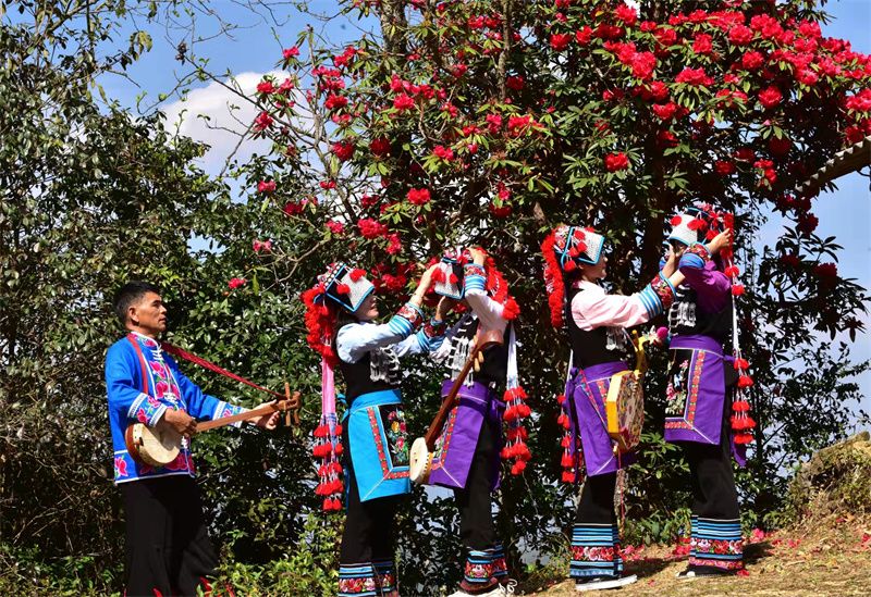 “东风满地春如海,欲向马缨问往年”。春天,大姚昙华山火红的马缨花争相怒放,花满枝头,飞红点翠。