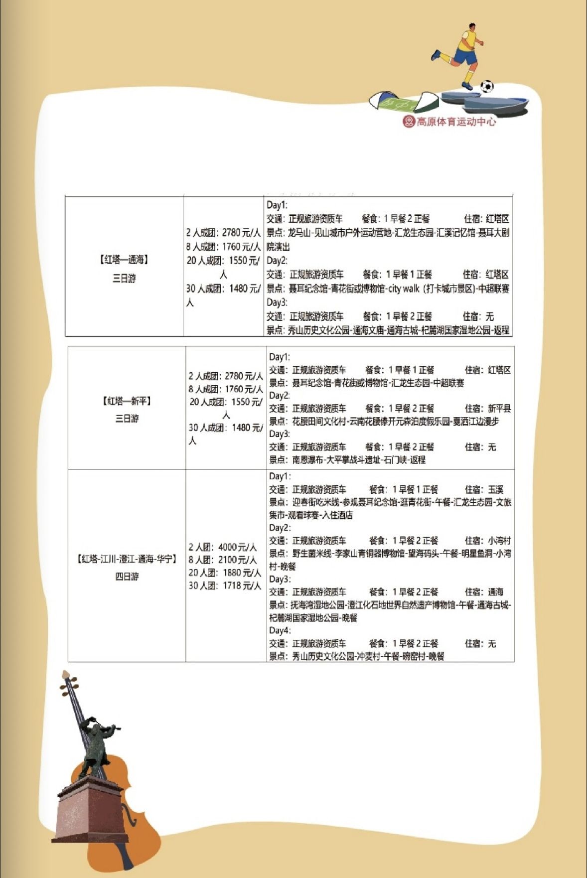 (江川区)云南李家山青铜器博物馆——星云湖国家湿地公园——(红塔区)汇龙生态园/映月潭修闲文化中心——青花街——聂耳纪念馆——青花街——小庙街/玉溪老街——玉溪高原体育运动中心(观看中超联赛)——(通海县)秀山历史文化公园——通海古城(赶迎春花街)——杞麓湖