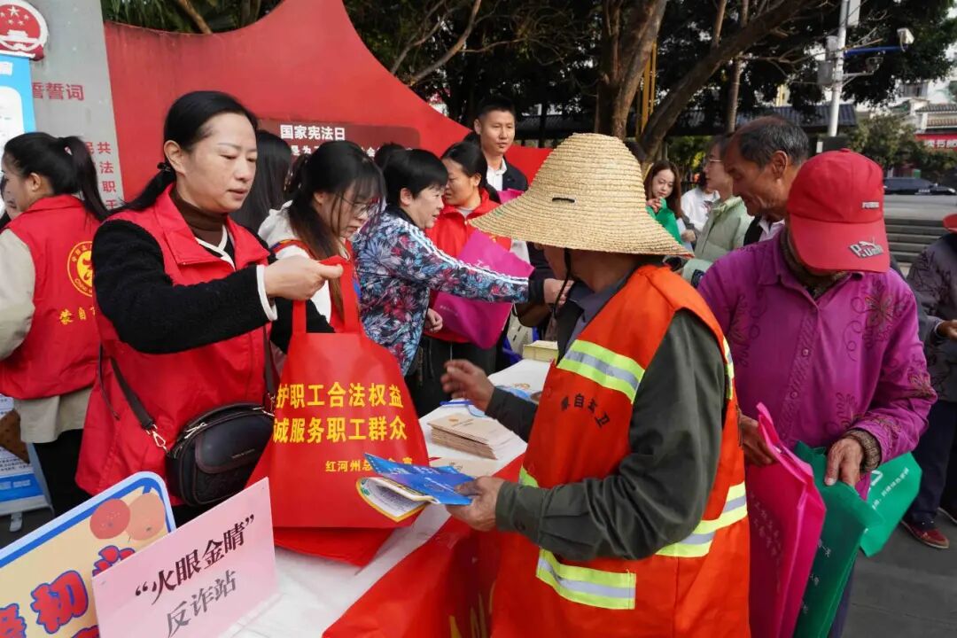 活动现场,红河州总工会与蒙自市总工会设立了宣传咨询台,志愿者们热情地向过往职工群众发放《中华人民共和国工会法》《中华人民共和国劳动法》《中华人民共和国劳动合同法》《保障农民工工资支付条例》以及职工医疗互助、法律援助、安全生产等与职工权益密切相关的法律法规和政策宣传资料。志愿者们耐心细致地为前来咨询的职工群众解答关于劳动合同签订、社会保险缴纳、工伤认定、工资拖欠等热点难点问题,引导广大职工学会运用法律武器维护自身合法权益。活动共发放各类宣传资料1000余份,接受职工群众咨询10余人次。