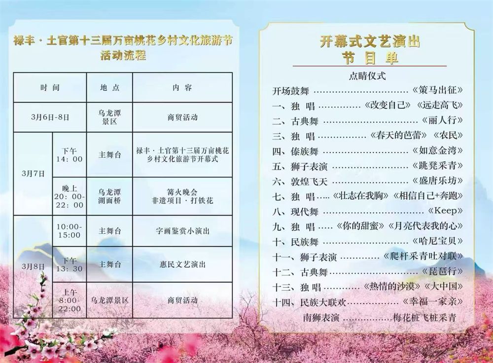 今年,土官桃花乡村文化旅游节将于7日14:00开幕。开幕式上,从开场鼓舞《策马出征》到独唱、古典舞、傣族舞、现代舞、民族舞及南狮表演,旅游节文艺演出将以歌舞寄情、以民俗聚心,为全镇各族群众和八方游客献上一场精彩的文化盛宴,推动文化惠民落地生根,助力乡村文化振兴。