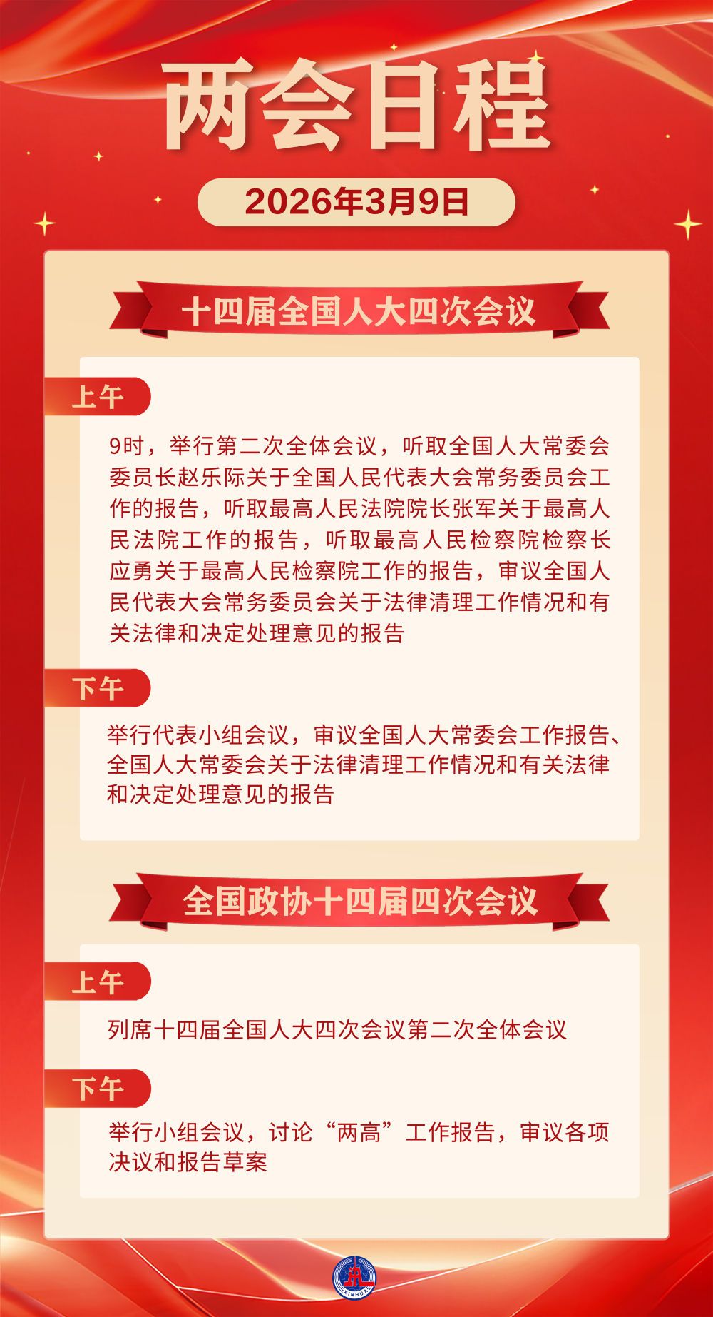 两会日程预告|3月9日:全国人代会举行第二次全体会议 听取全国人大常委会工作报告和“两高”工作报告 2026-03-09 08:58 新华社 0 3月9日,全国人代会举行第二次全体会议,听取全国人大常委会工作报告和“两高”工作报告。 来源 新华社 责编 杨奥 校对 童文文 审核 李元