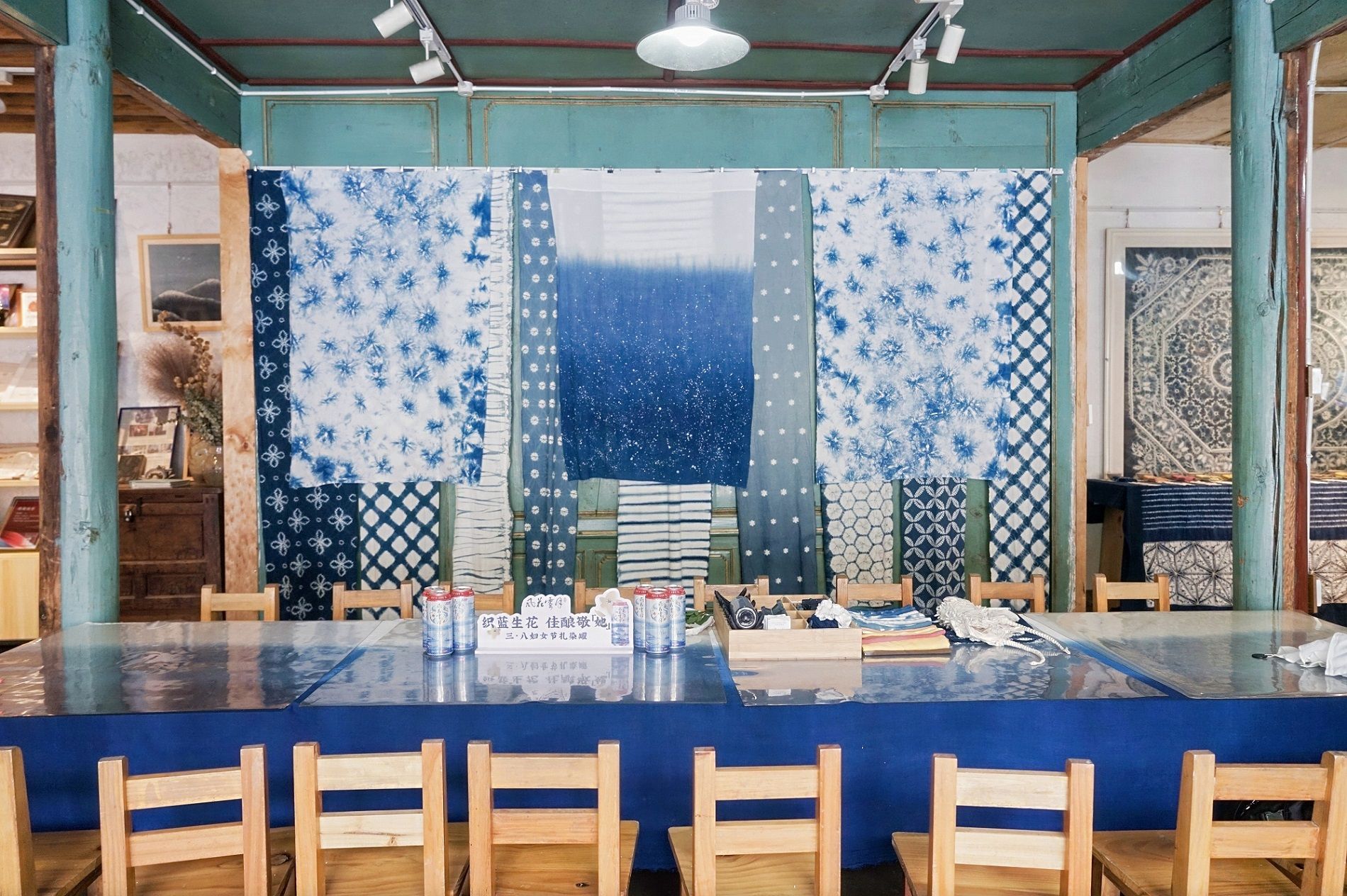 张翰敏女士向嘉宾展示扎染艺术共创长卷,并邀请在场嘉宾体验扎染艺术,感受“织蓝生花”的非遗魅力。
