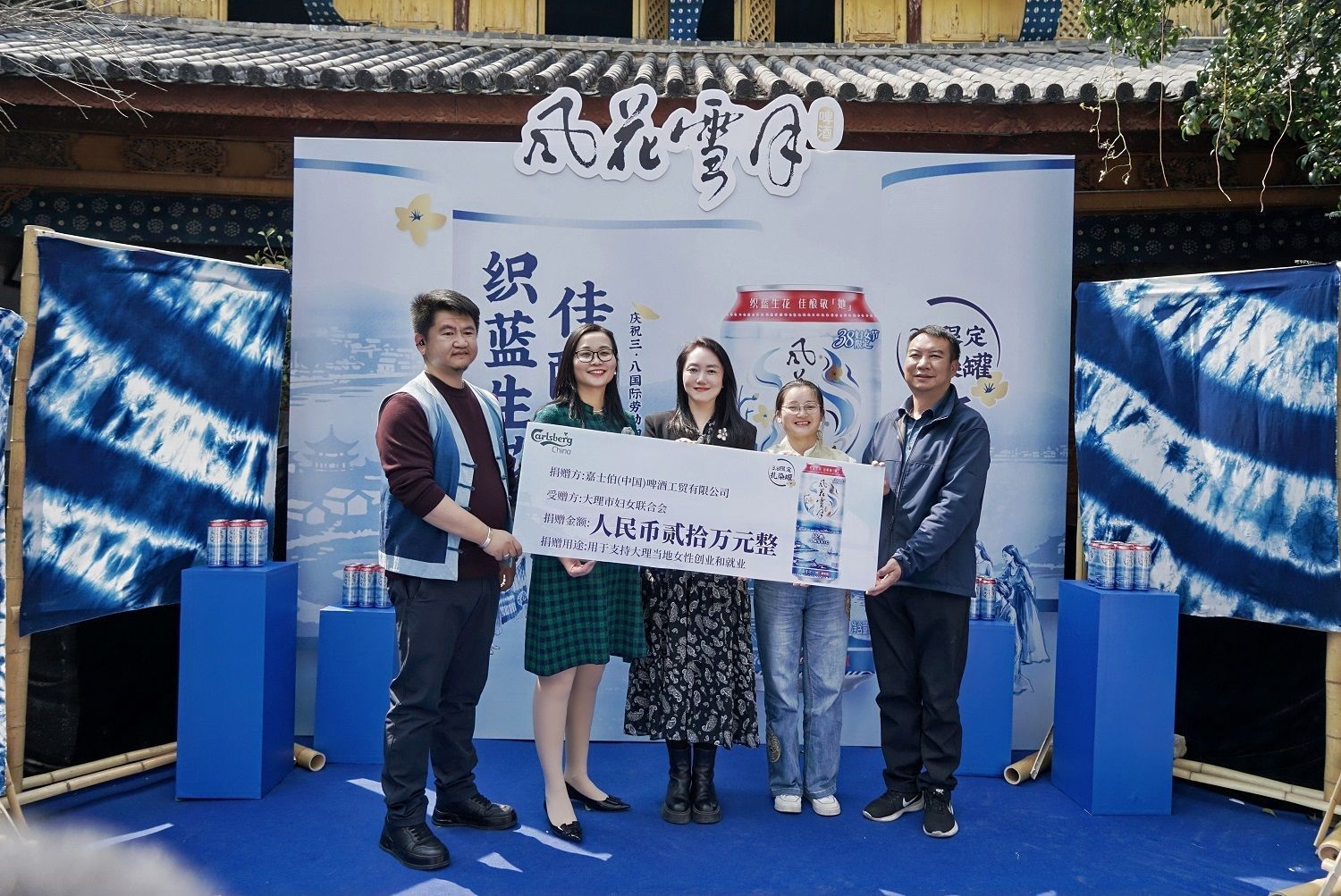 2026年3月8日,风花雪月啤酒与国家非遗白族扎染技艺传承人张翰敏女士跨界合作,以“织蓝生花 佳酿敬她”为主题,推出限定风景扎染罐。活动现场,嘉士伯(中国)啤酒工贸有限公司向大理市妇女联合会捐赠20万元,支持当地女性创业就业。
