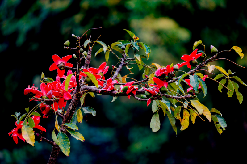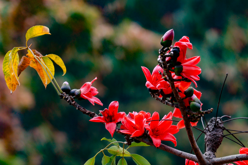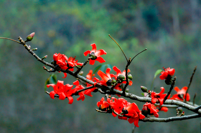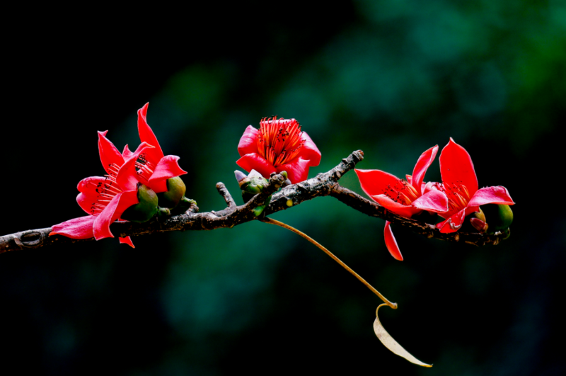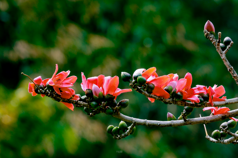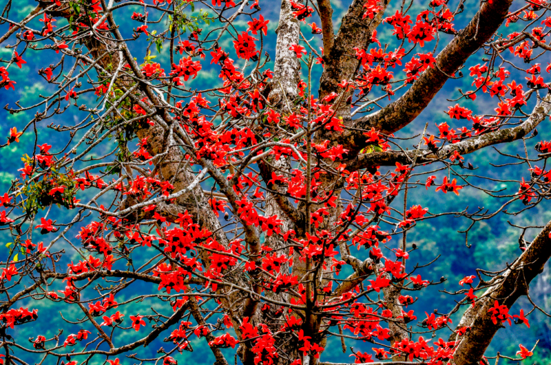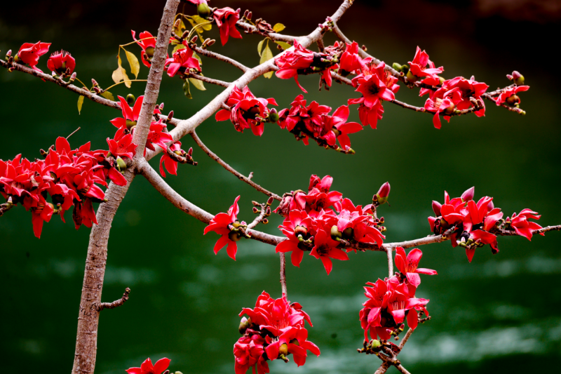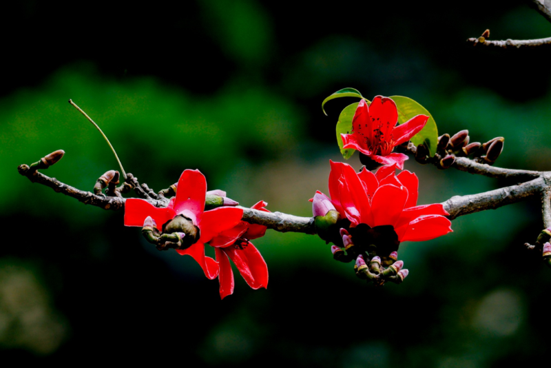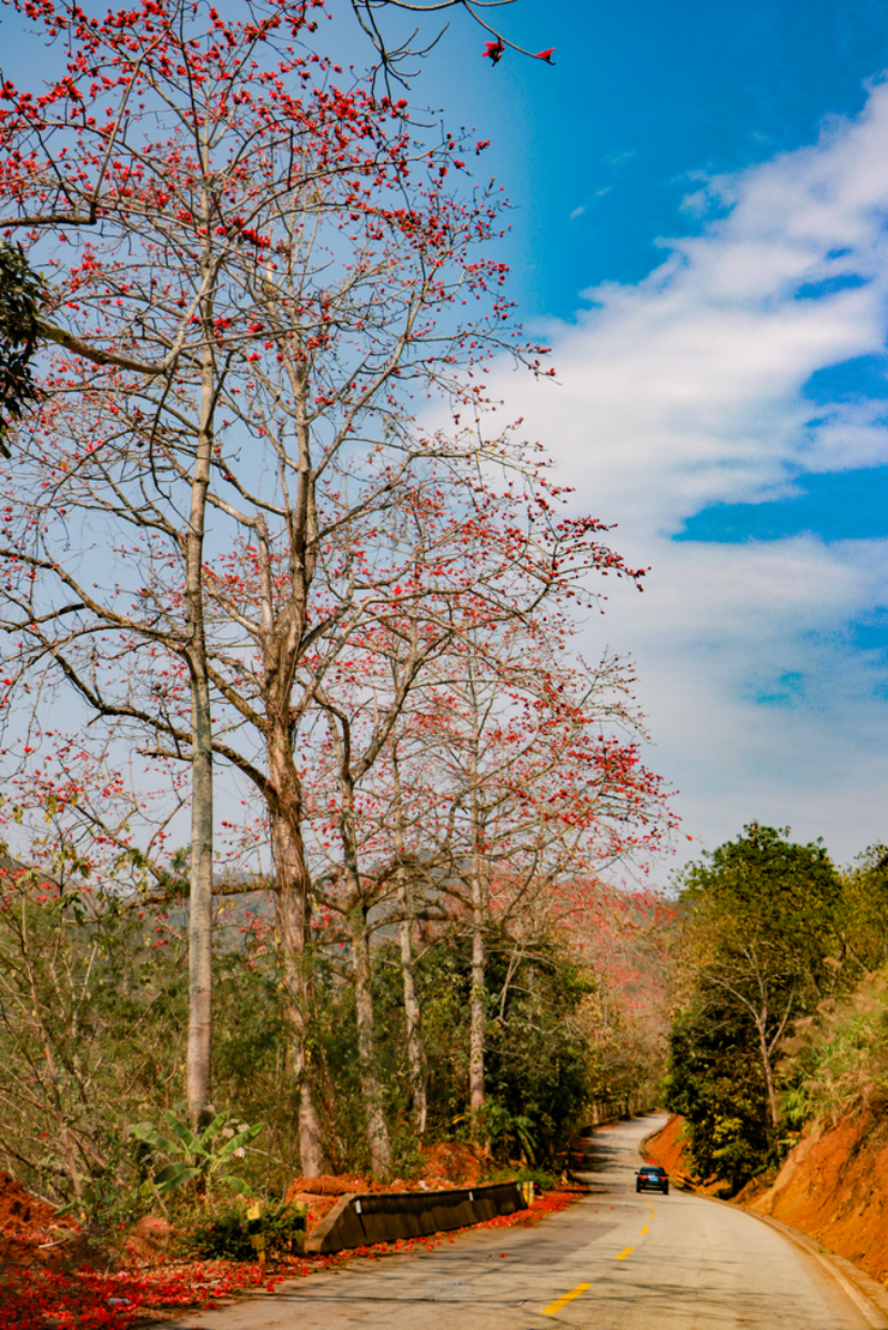 当地人又把它称之为“英雄花”,因其花开红艳如英雄鲜血,花落时整朵旋转坠地,掷地有声,依然保持完整姿态,不显凋零之态,颇有壮士风骨。在民族村寨,人们还喜拾取新鲜花瓣晾干,用以煲汤煮粥,既应景又养生。
