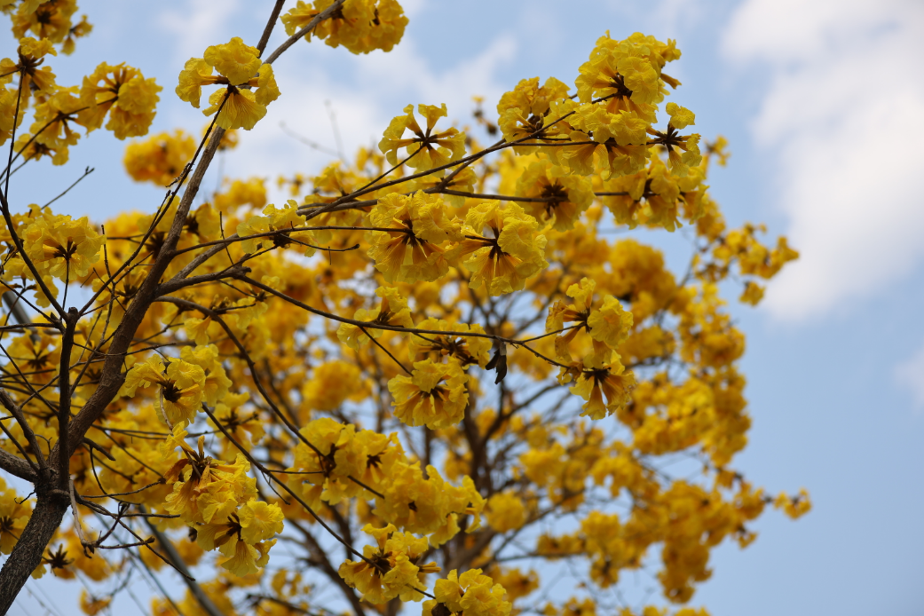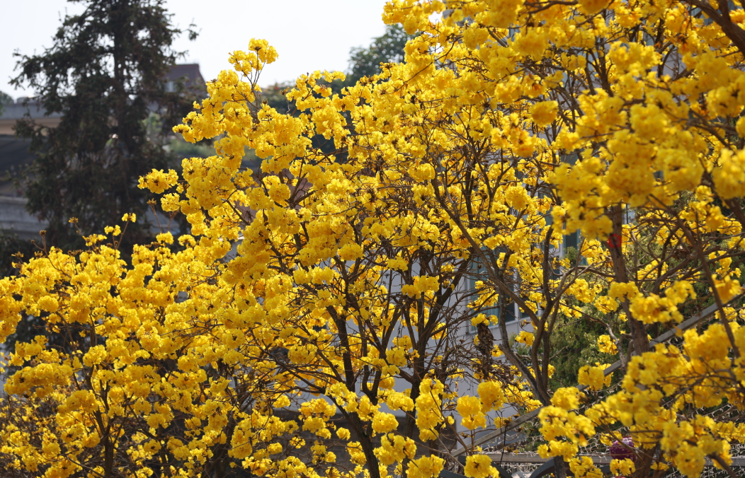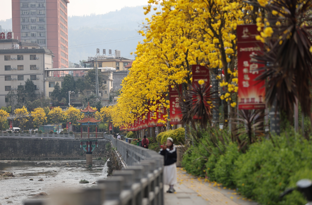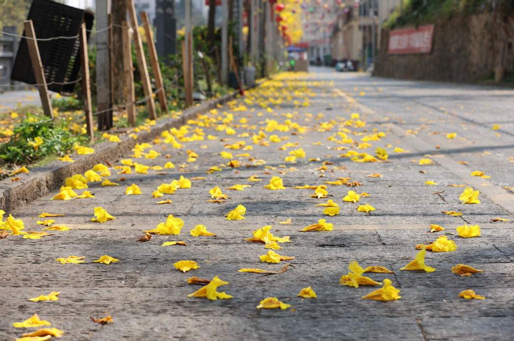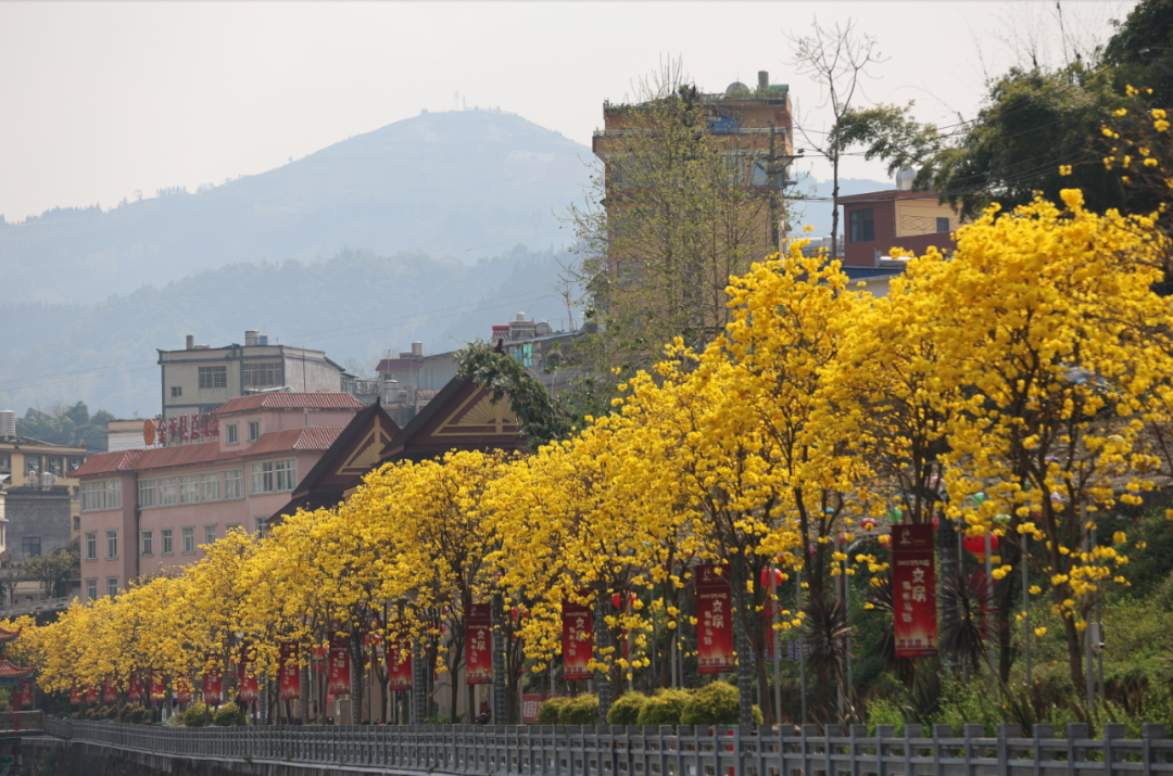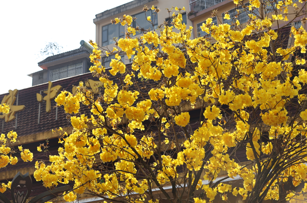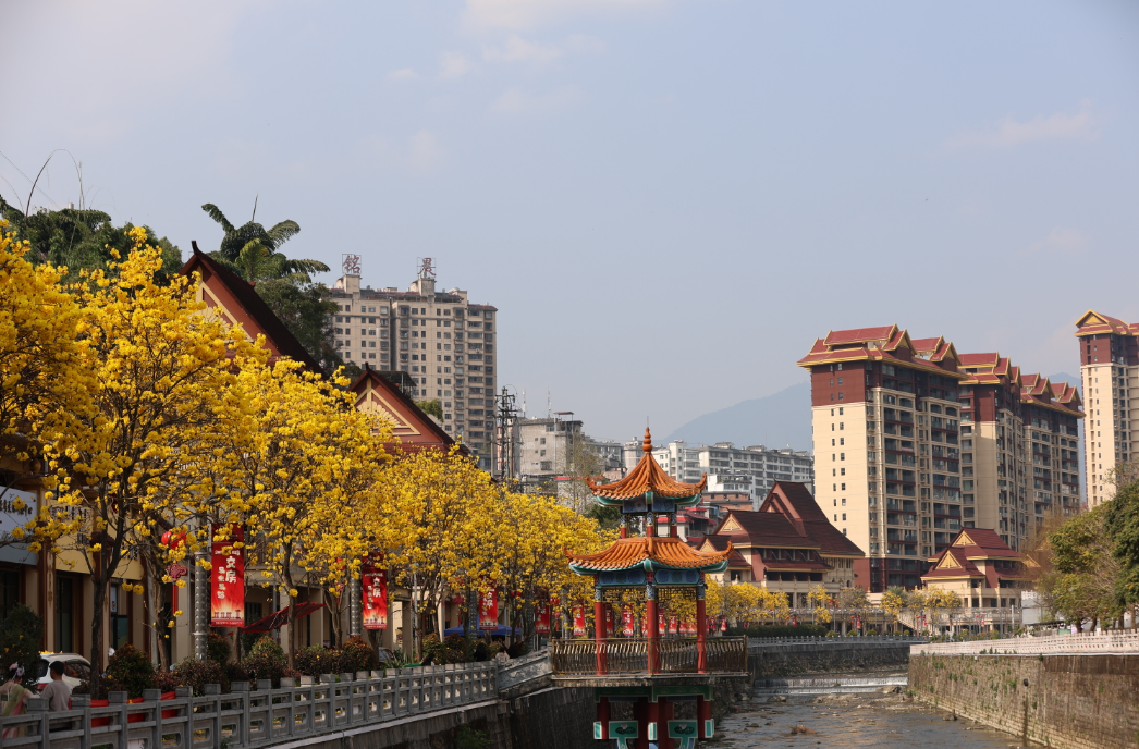 近日,金平傣族风情街的黄花风铃木如约盛放,枝头缀满金黄花铃,满树鎏金、风铃轻摇,把整条街道酿成春日限定的金色浪漫,成为市民争相打卡的网红赏花点。