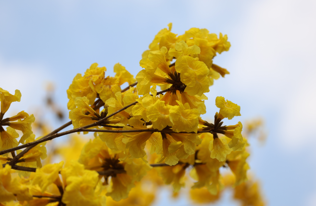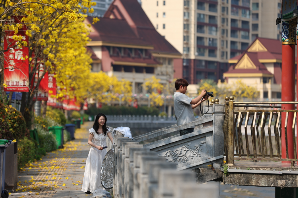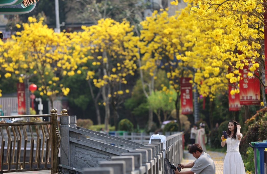黄花风铃木,又名黄钟木,紫葳科落叶乔木。春季先花后叶,满树绽放漏斗状金黄花朵,形似风铃,明艳夺目,纤细花梗随风轻摆,似风铃轻响。眼下,金傣风情街沿线风铃花进入盛花期,漫步街头,金黄花簇与街区烟火气相融,随手一拍便是氛围感大片,朋友圈刷屏素材已就位,不少市民、游客驻足拍照,用镜头定格金色春光。