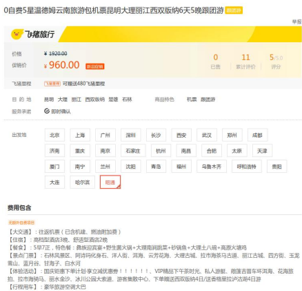 该旅游产品广告链接:0自费5星温德姆云南旅游包机票昆明大理丽江西双版纳6天5晚跟团游