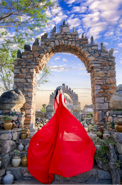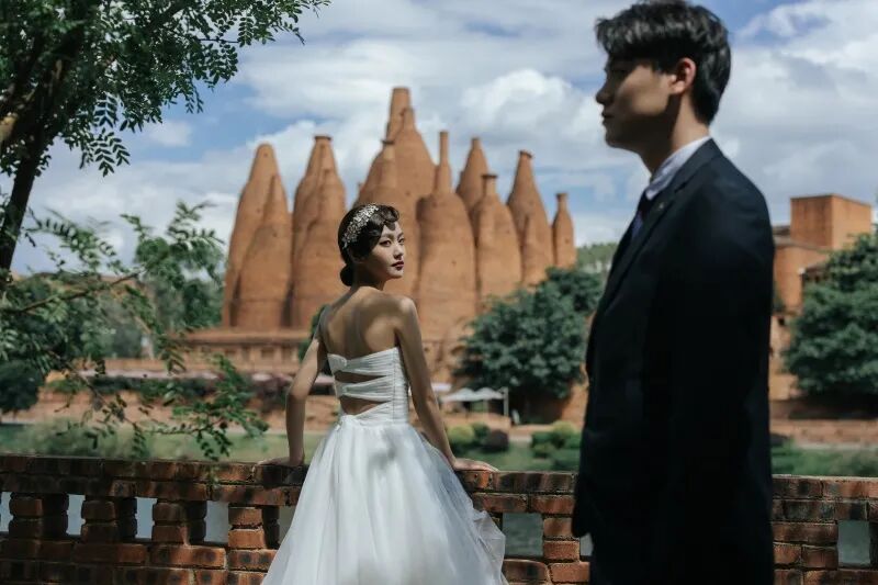 换上旗袍长衫,牵起爱人的手漫步铁轨,汽笛声仿佛将时光拉回百年前。百年站台、安南咖啡馆、寸轨公园……每一处都是电影感的天然片场。夕阳西下时,柔和光线穿过百叶窗,为婚纱照镀上一层复古滤镜。
