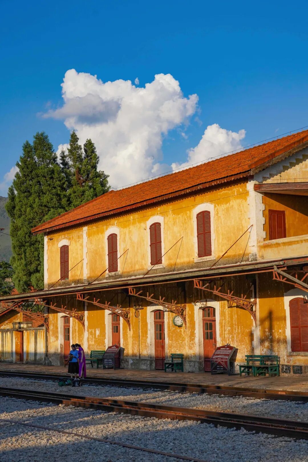 这里是《芳华》《无问西东》的取景地,也是百年滇越铁路的时光驿站。黄墙绿瓦的法式站房、停摆的双面钟、斑驳的水塔,诉说着“东方小巴黎”的旧日风华。