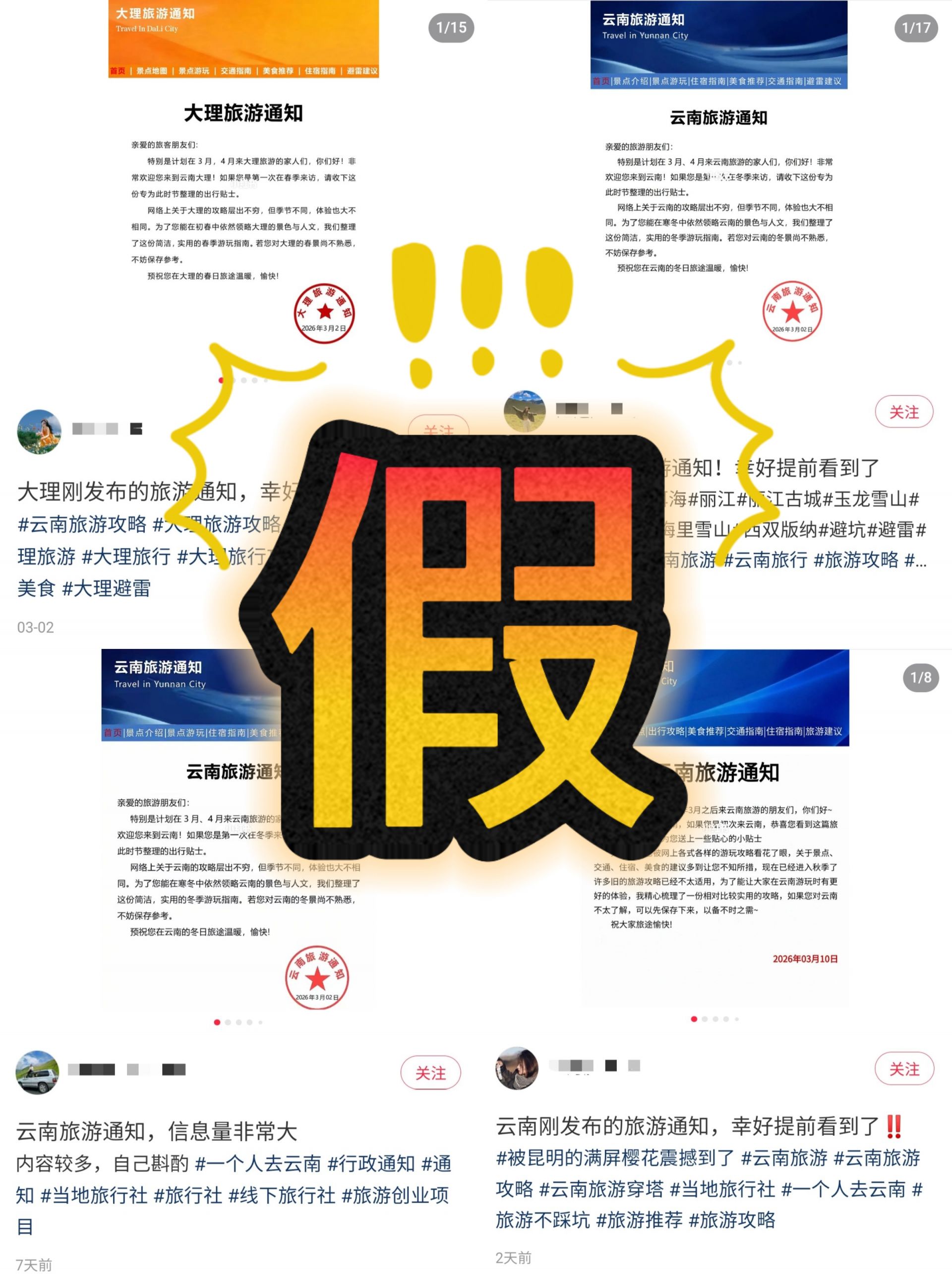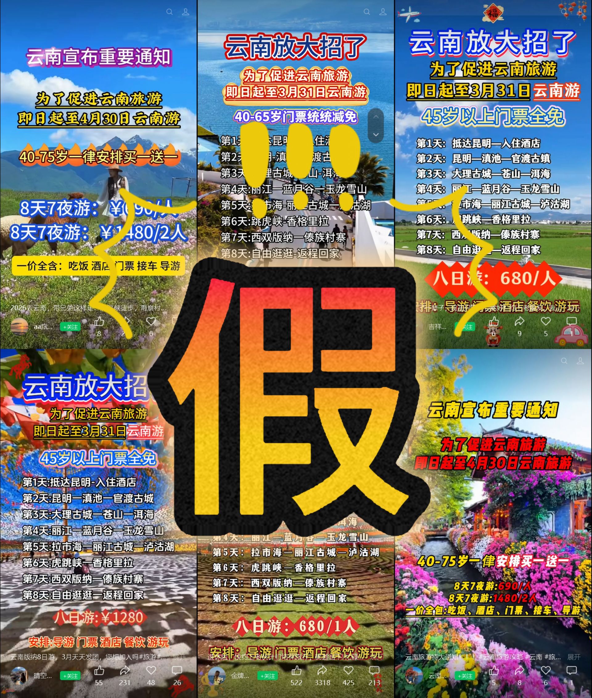 又到“3·15”国际消费者权益日,旅游消费市场的各类陷阱再次成为关注焦点。近期,文旅头条新闻网通过系统监测发现,小红书APP、微信视频号等平台出现多篇以“云南放大招了,为了促进云南旅游,即日起至3月31日云南游45岁以上门票全免”为噱头的旅游揽客宣传,经核实,此类宣传均为虚假信息。