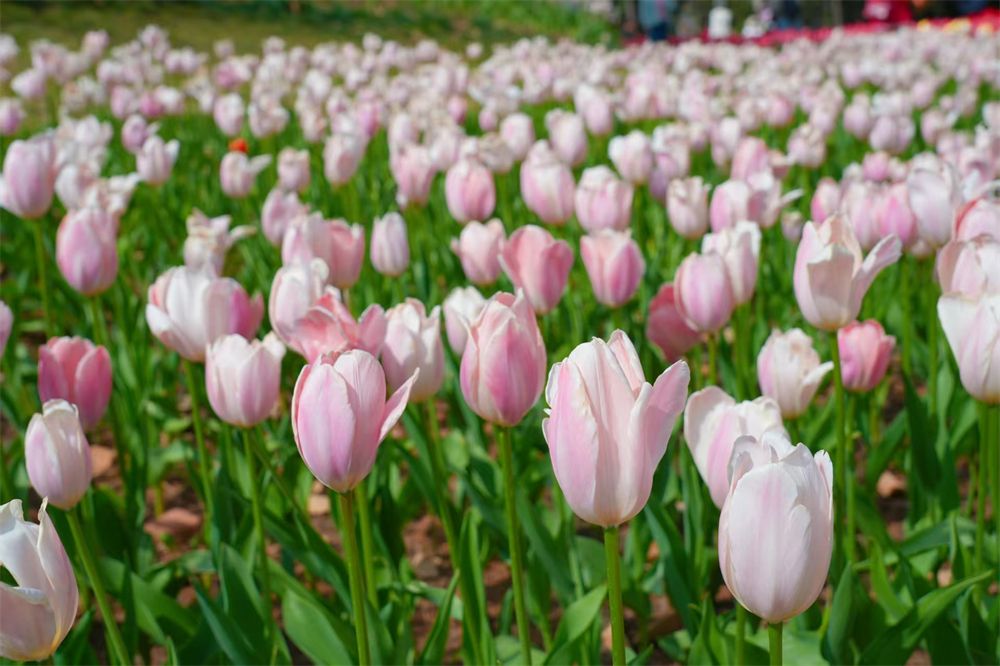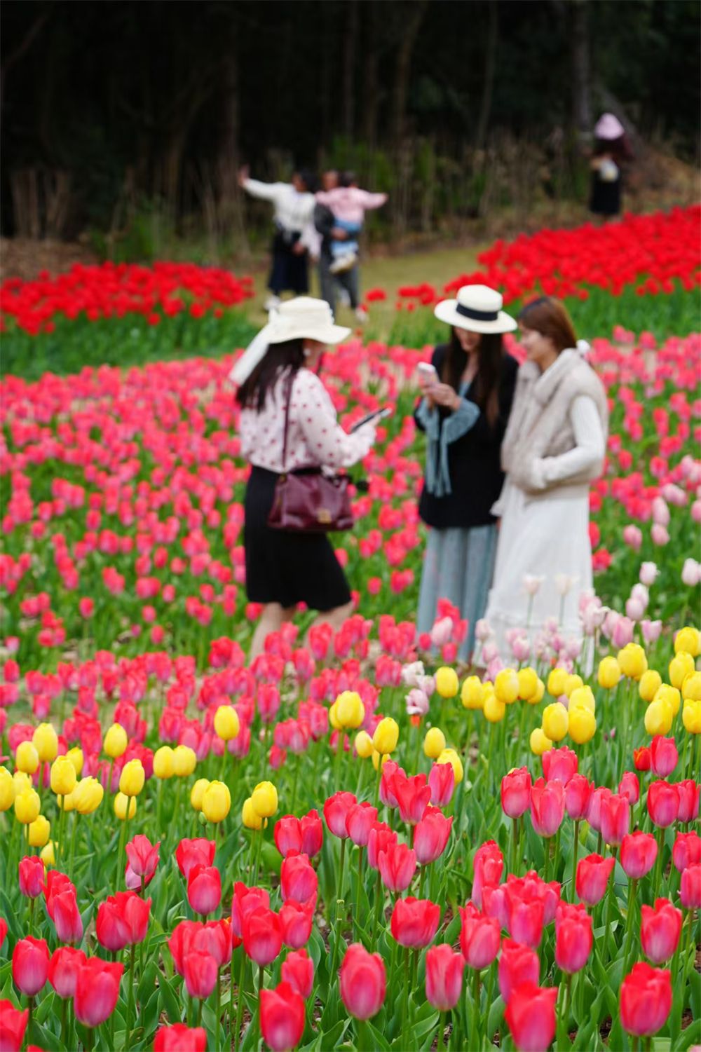 这里,6000㎡的郁金香花海正值观赏期,10万株各色郁金香沿着山径铺陈开来,层层花浪随风摇曳,错落成景。