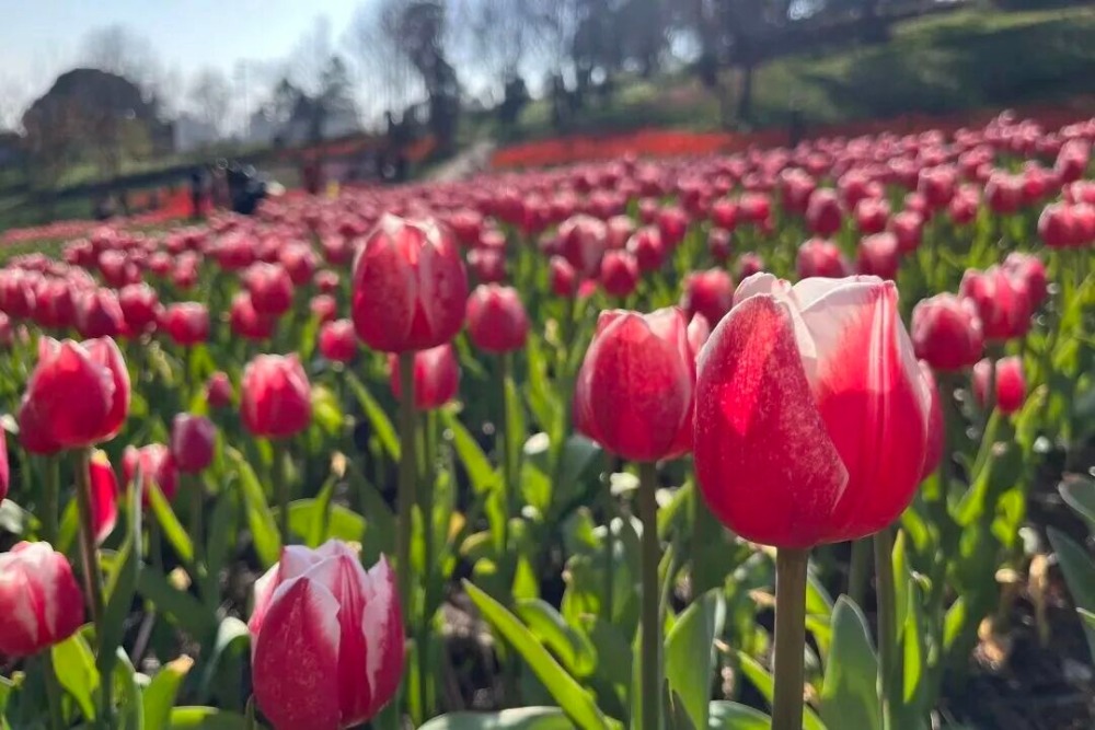 这里的郁金香颜色丰富,红的热烈、粉的温柔、黄的明媚、白的纯净……不同品种、不同色系的花朵交织在一起,每一步都像走进了童话世界。
